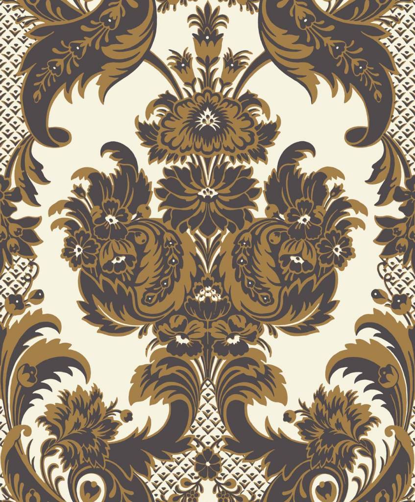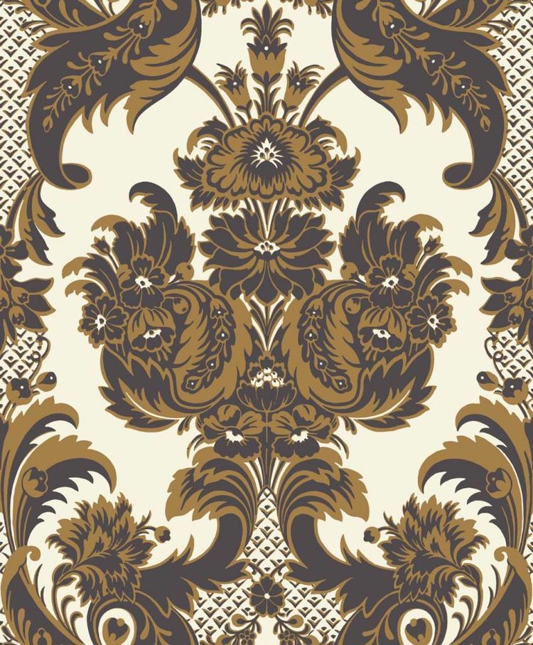 A stylish surface printed floral damask wallpaper in five luxurious colourways. This luxury wallpaper pattern has been cast in moody fashion tones of slate grey, peacock blue, old gold, carmine and pearly grey, Wyndham was inspired by the decorative mouldings and gilding on display in the London theatre of the same name.