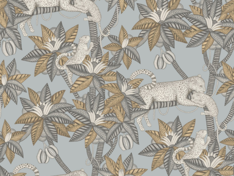 This peaceful design includes fans of leaves and curving trunks and vines, all richly ornamented with precise stripes and scallops. The leopards' fur has a more untamed pattern, in tawny orange, soft metallic gold and bronze, as well as a ghostly mica sheen, as if in a dreamscape.