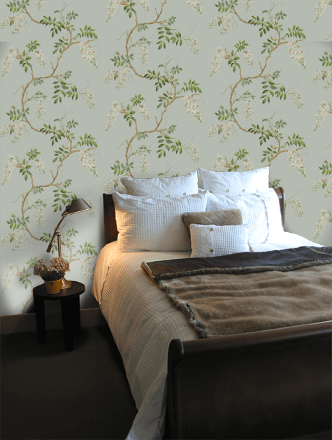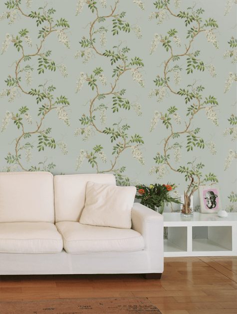 A beautiful wisteria path, delicately drawn with soft painterly flowers and wispy leaves. Shown in white and green, on a deep aqua green background.