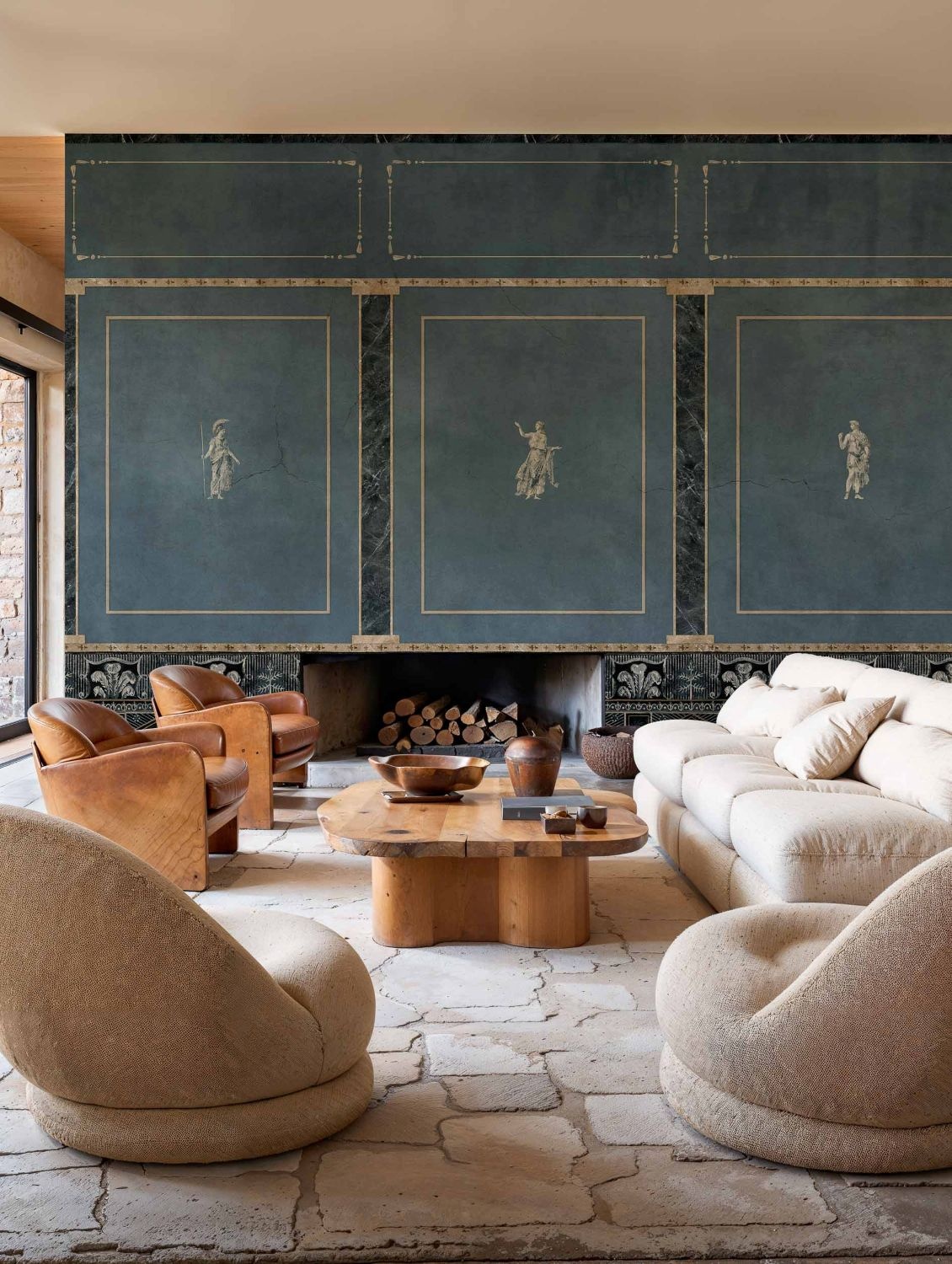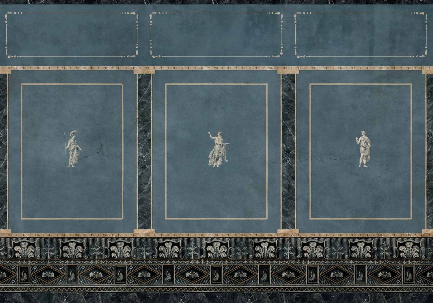 The Pompei wallpaper is perfect for spaces such as living rooms, bedrooms, entrances, studies, and hospitality settings, where atmosphere, elegance, and a sense of historical character take centre stage.