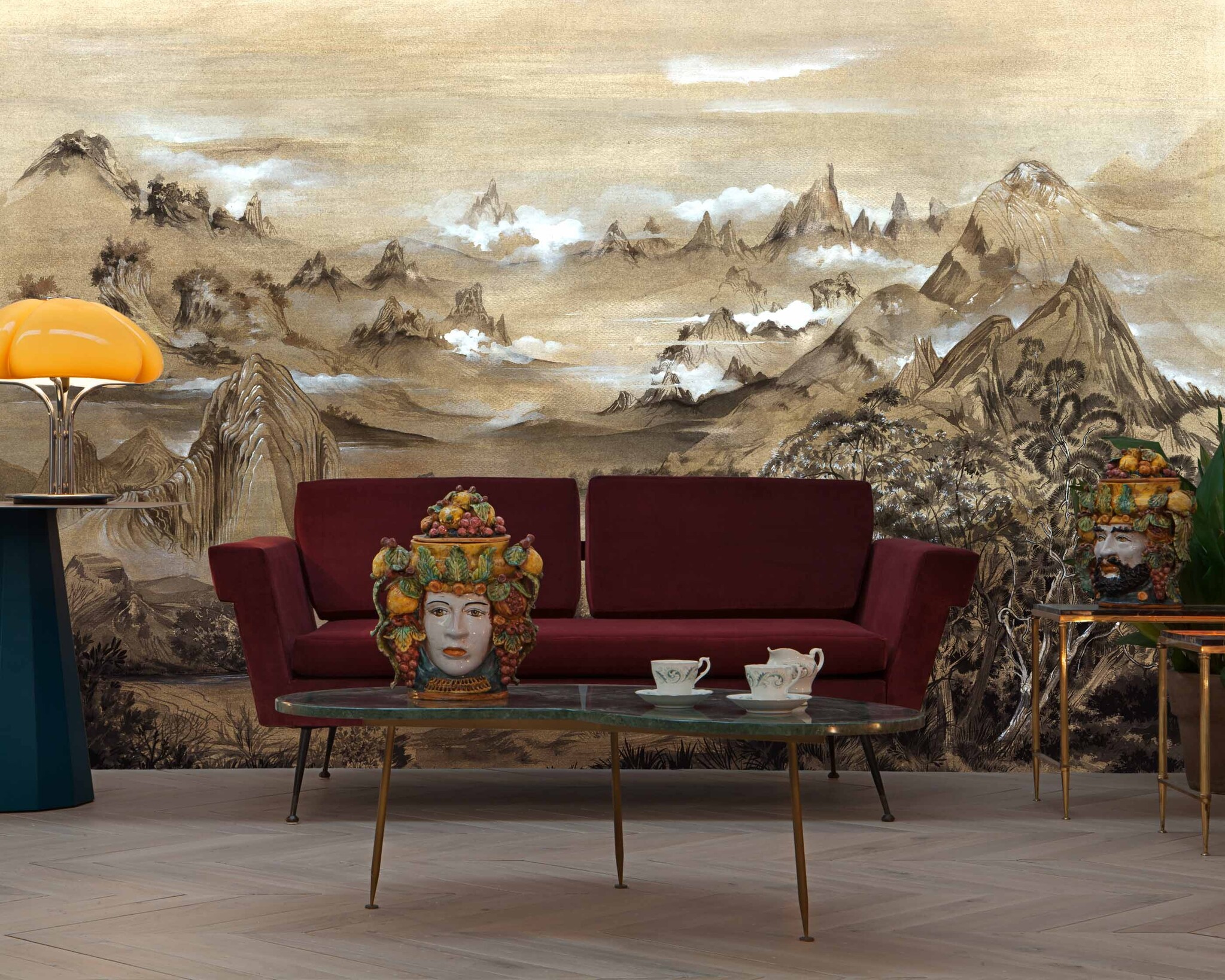 Coordonné's “Random Chinoiseries II” collection is inspired by famous frescoes with oriental influences of the extravagant landscapes that once adorned the walls of ancient Japanese and Chinese dynasties. An abundance of ornaments immerses the viewer in a utopian setting, where mountain landscapes, whimsical flowers, birds and unique creatures evoke wonder.