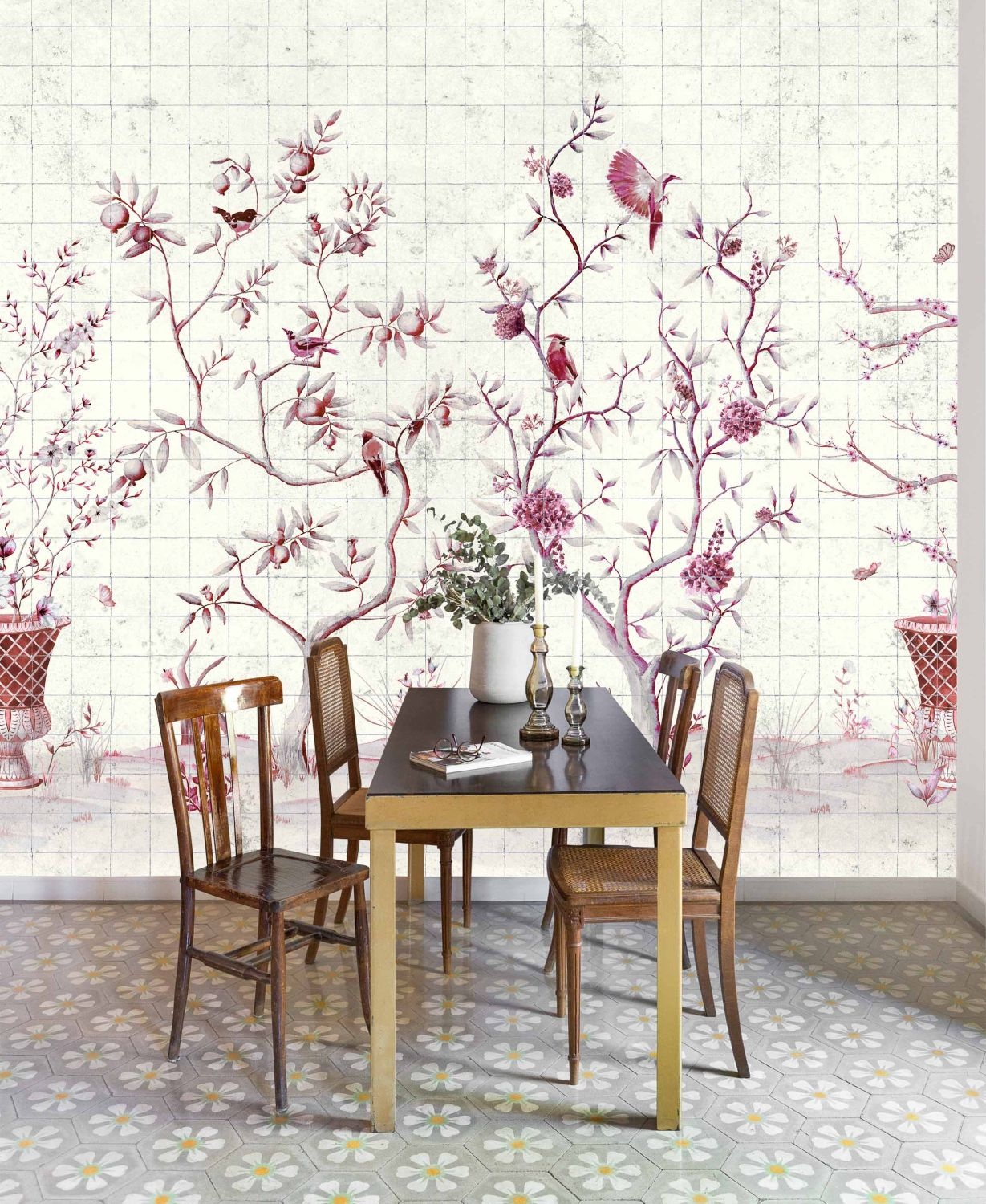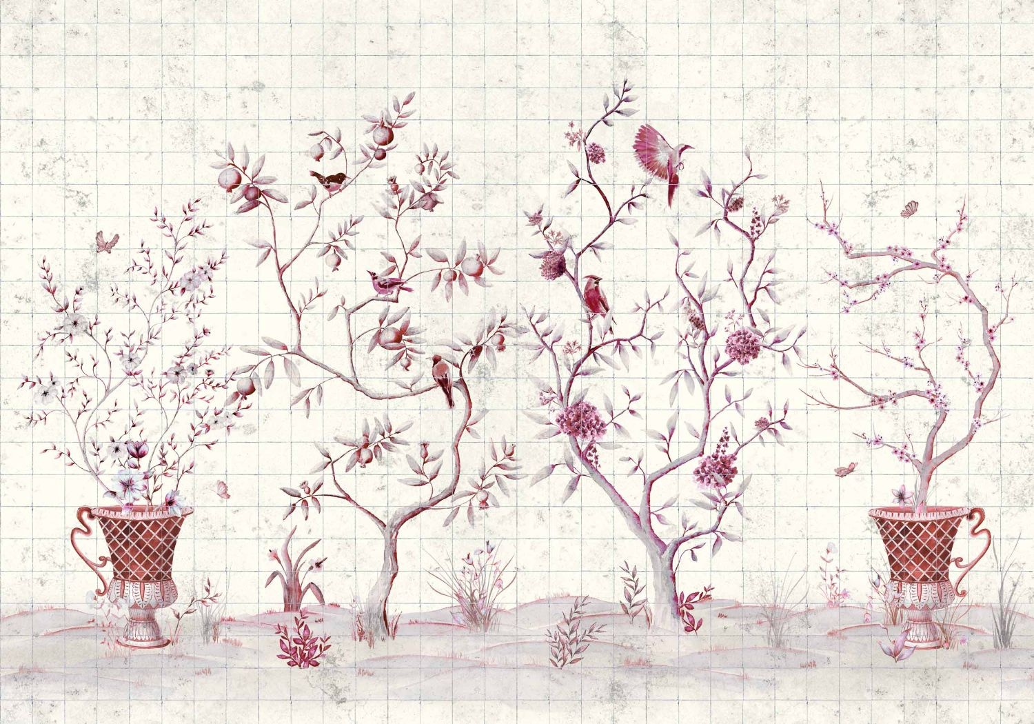 Coordonné's “Random Chinoiseries II” collection is inspired by famous frescoes with oriental influences of the extravagant landscapes that once adorned the walls of ancient Japanese and Chinese dynasties. An abundance of ornaments immerses the viewer in a utopian setting, where mountain landscapes, whimsical flowers, birds and unique creatures evoke wonder.