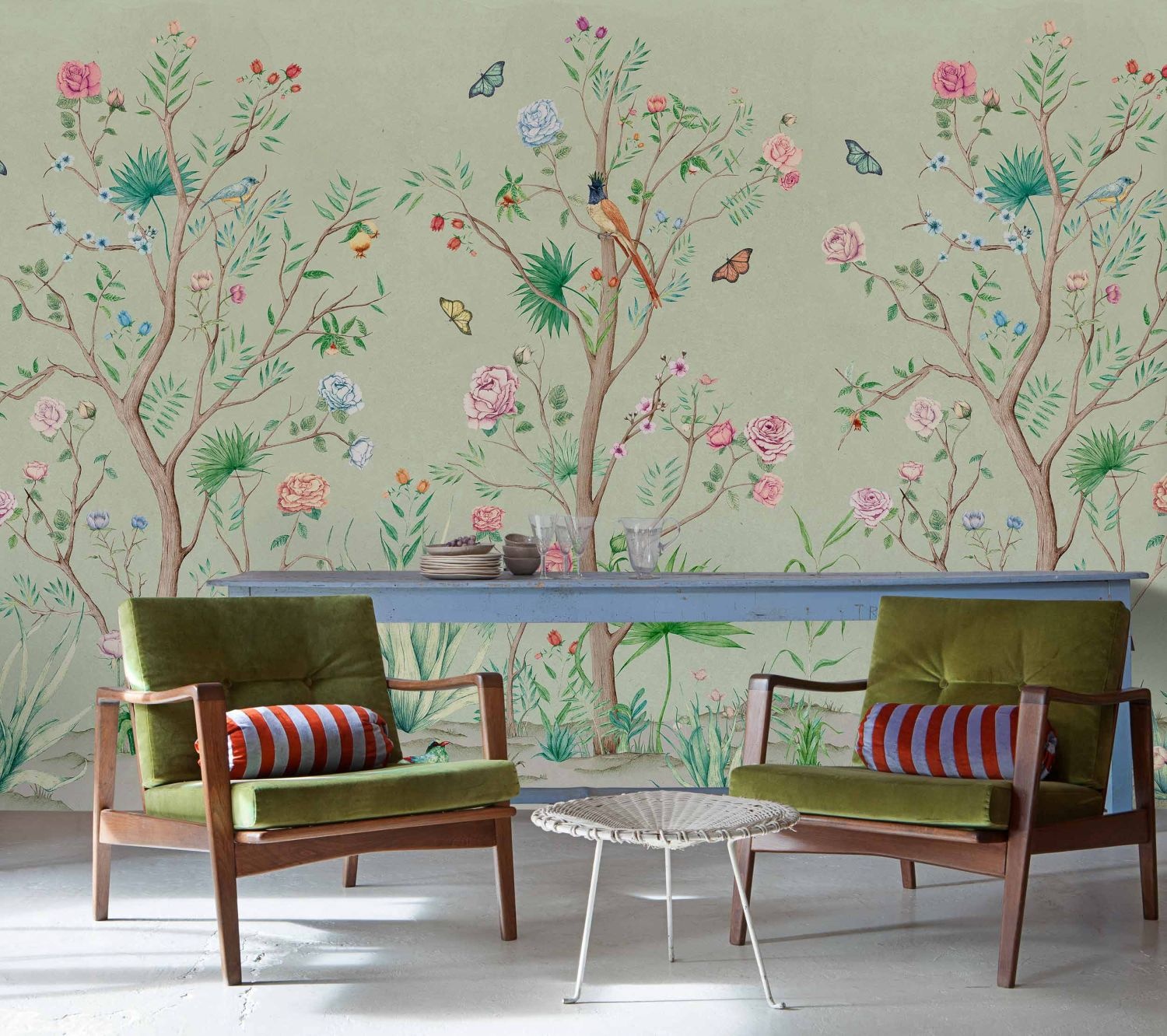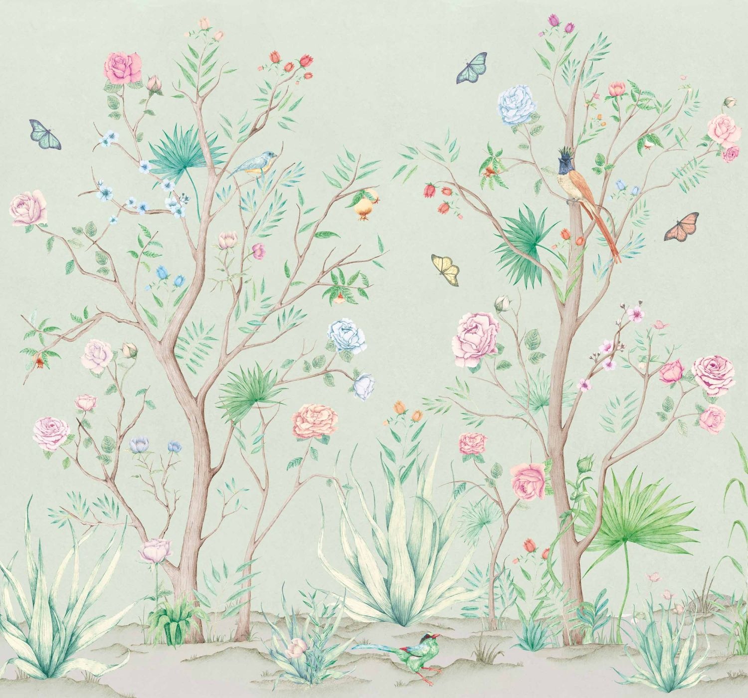 Coordonné's “Random Chinoiseries II” collection is inspired by famous frescoes with oriental influences of the extravagant landscapes that once adorned the walls of ancient Japanese and Chinese dynasties. An abundance of ornaments immerses the viewer in a utopian setting, where mountain landscapes, whimsical flowers, birds and unique creatures evoke wonder.