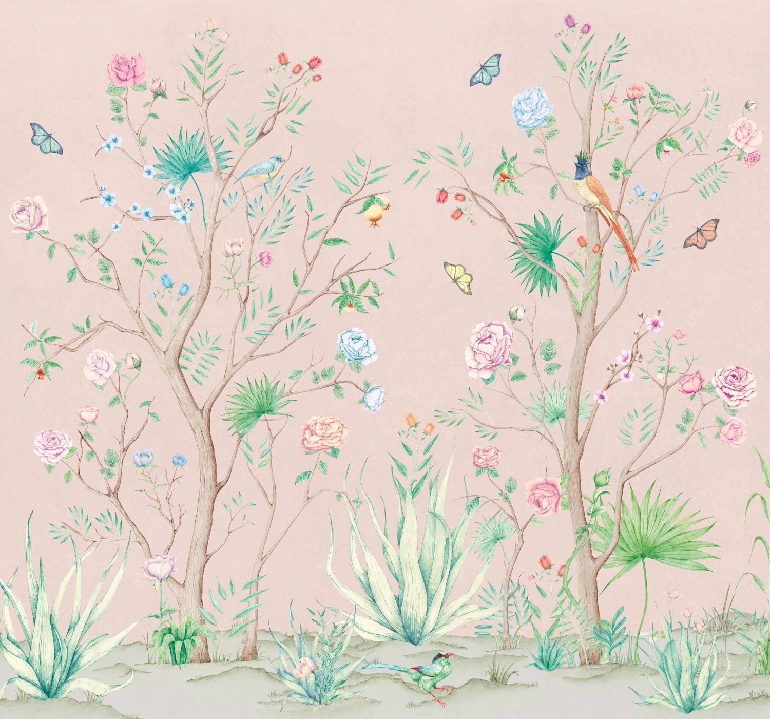 Coordonné's “Random Chinoiseries II” collection is inspired by famous frescoes with oriental influences of the extravagant landscapes that once adorned the walls of ancient Japanese and Chinese dynasties. An abundance of ornaments immerses the viewer in a utopian setting, where mountain landscapes, whimsical flowers, birds and unique creatures evoke wonder.