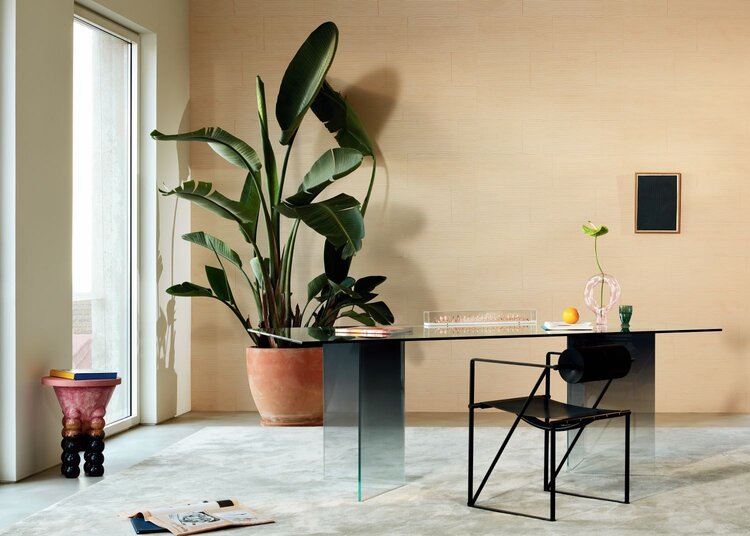 This collection by Élitis is a collaboration with Callidus Guild. It is based on the simplicity of traditional plasterwork and celebrates imperfect simplicity. Each stroke reflects the mastery of ancient techniques, meticulously replicating and refining the nuances of traditional plasterwork, a testament to meticulous craftsmanship. The collection is complemented by a special abstract floral panorama. In this wall covering, 18th-century floral motifs, which originally appeared in the finest hand-woven silk, have been enlarged and meticulously hand-painted in several variations.