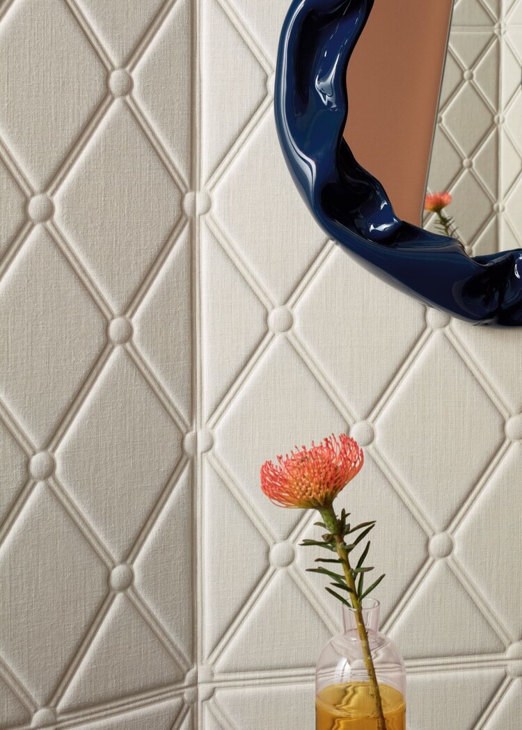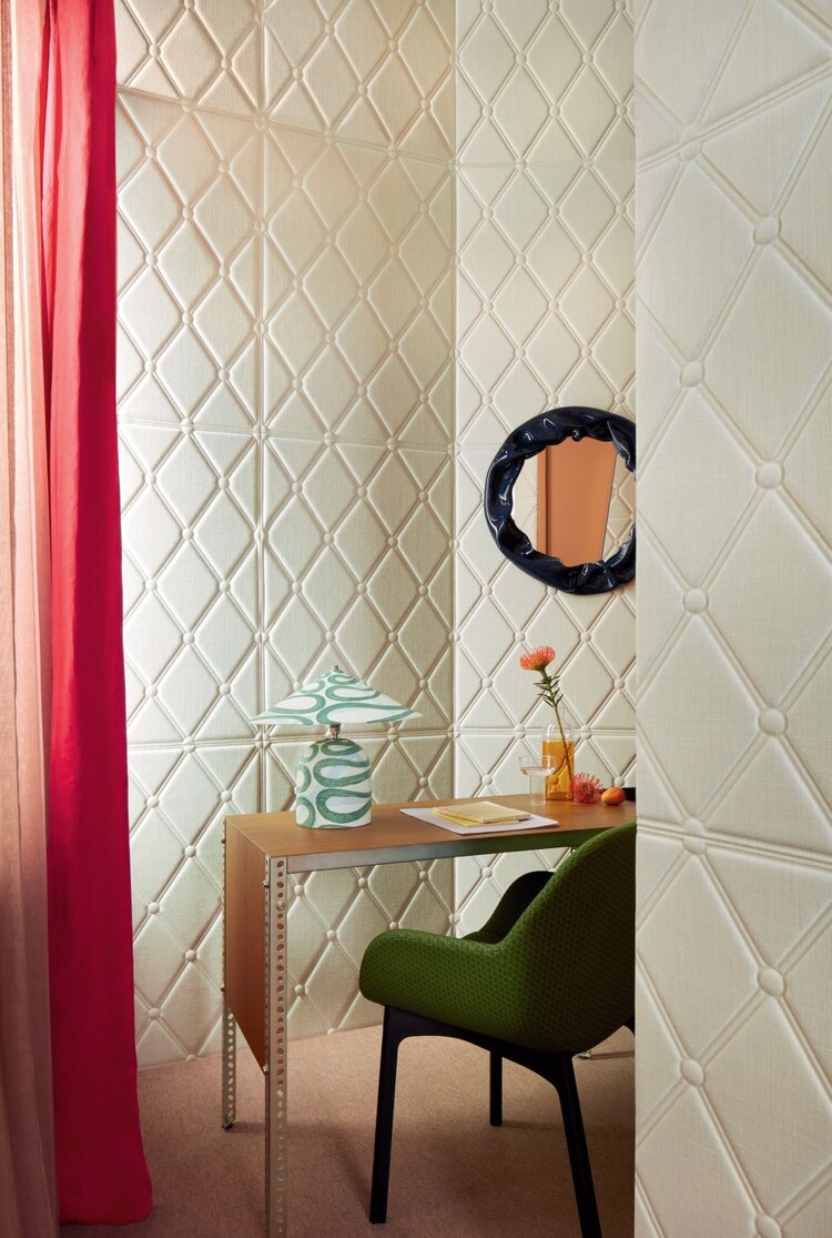 The diversity of the geometric patterns in this 3D collection by Élitis offers an extensive range of possibilities for creating monochrome or colourblock interiors.