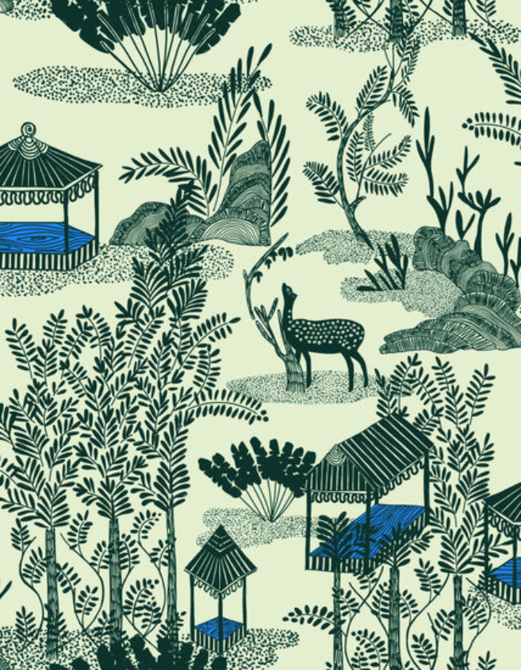 ELITIS Siam wallpaper is a beautiful wallpaper with an Asian appearance. The illustrated, graceful trees, shrubs, deer and cultural architecture provide a cheerful touch to your interior. The designers of this wallpaper were inspired by idyllic landscapes.