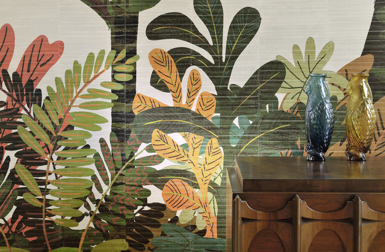 Waiting for Eve wallpaper is a beautiful panel from the ELITIS Legend wallpaper collection. This panel consists of a botanical print of leaves and palms, printed on a ground of the popular Anguille. A sublime combination and of course perfect to combine with the 'plain' Anguille wallpaper.