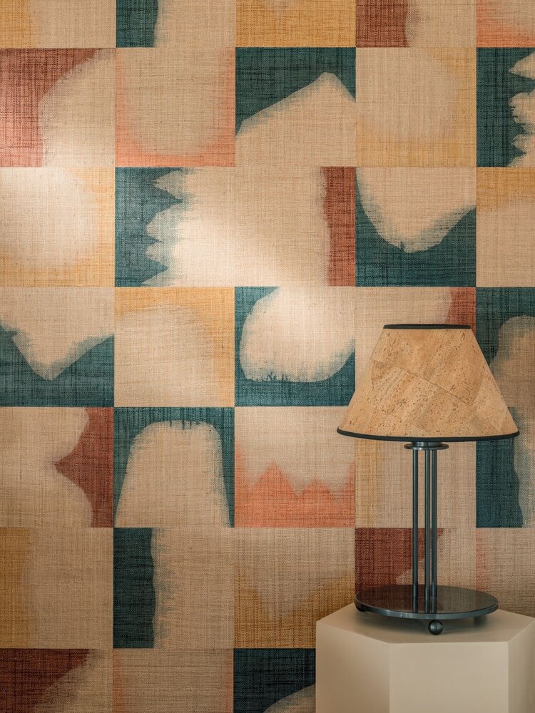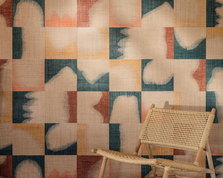 Tribus is a playful collection of natural fibers such as sisal, abacá and arrowroot, with unique textures and colors. Oriental embroidery and raffia create a bohemian look. Large wall panels with Spanish influences are hand-painted on silk. Tribus gives plant fibers a modern, colorful twist.