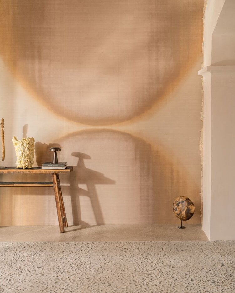Tribus is a playful collection of natural fibers such as sisal, abacá and arrowroot, with unique textures and colors. Oriental embroidery and raffia create a bohemian look. Large wall panels with Spanish influences are hand-painted on silk. Tribus gives plant fibers a modern, colorful twist.