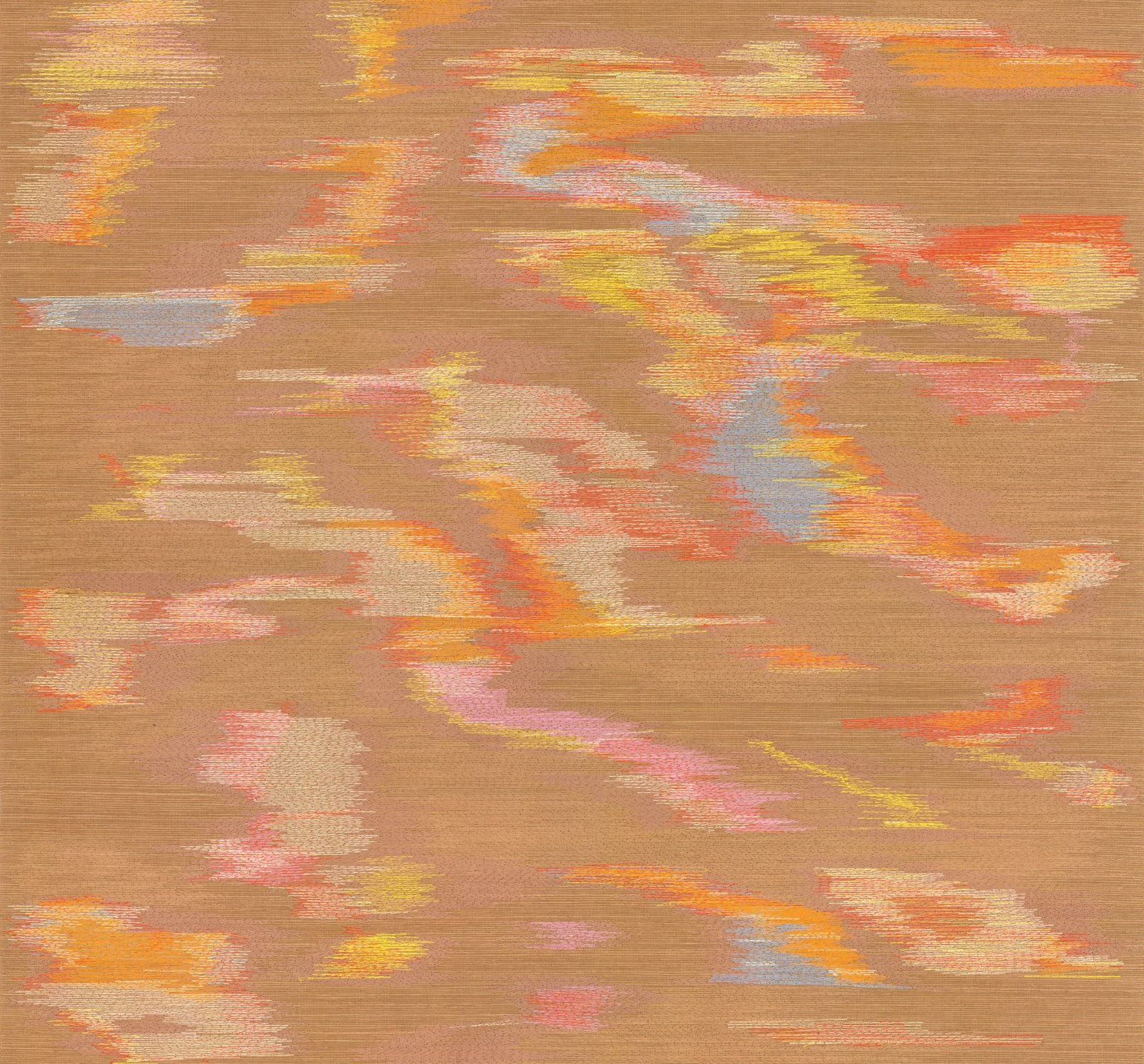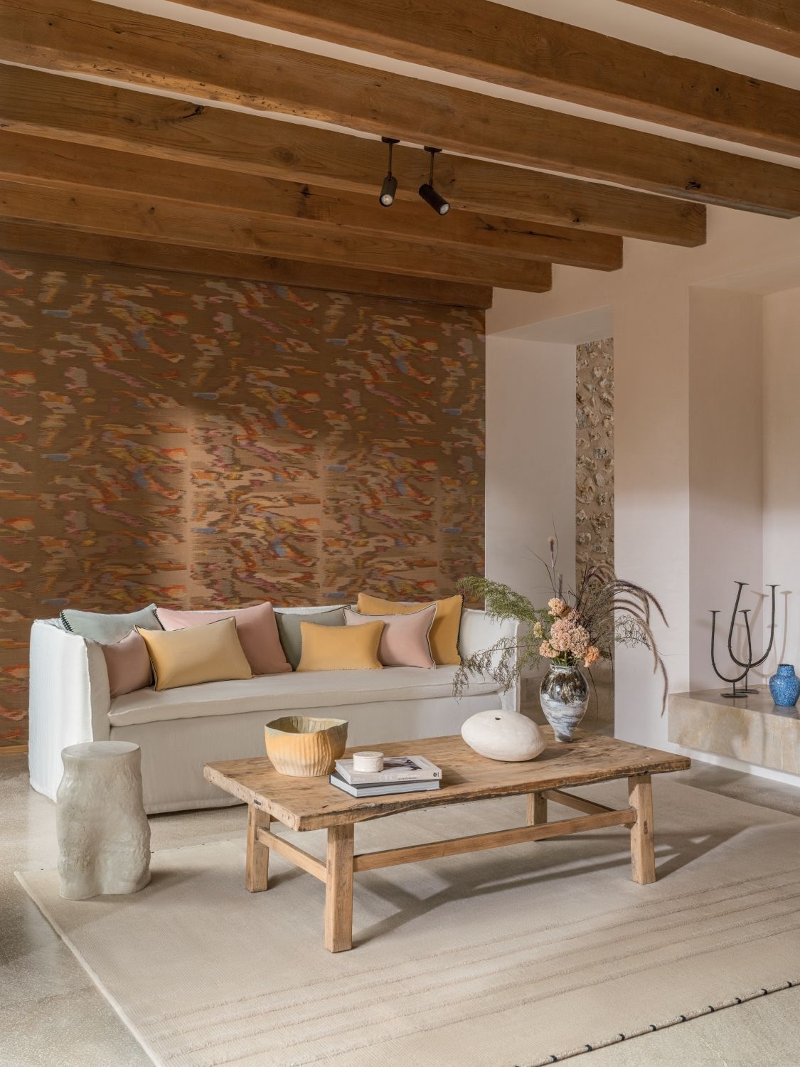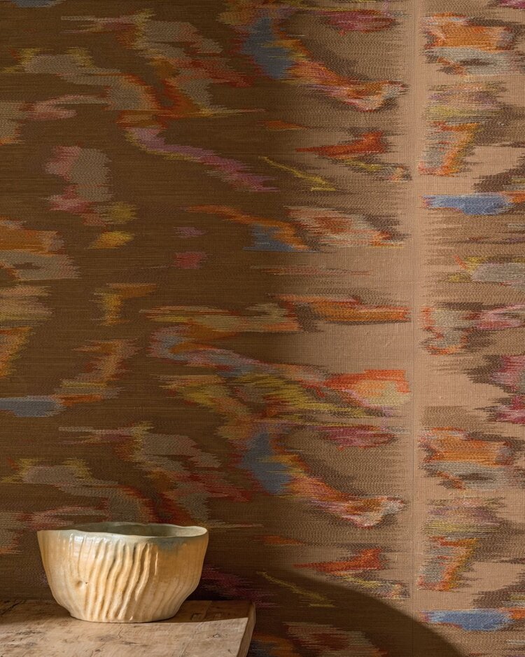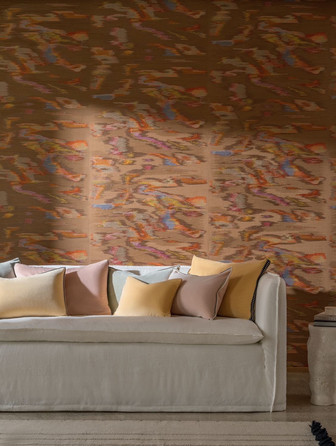 Tribus is a playful collection of natural fibers such as sisal, abacá and arrowroot, with unique textures and colors. Oriental embroidery and raffia create a bohemian look. Large wall panels with Spanish influences are hand-painted on silk. Tribus gives plant fibers a modern, colorful twist.