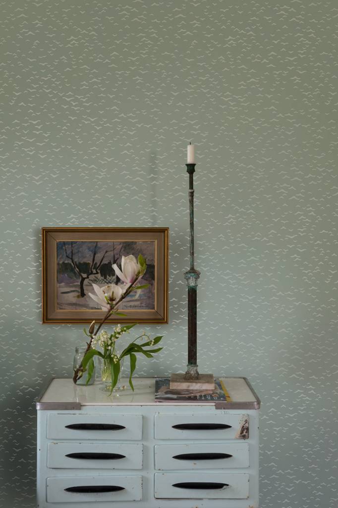 Discover soft color palettes, stunning stripes and monochrome, minimalist looks in the beautiful wallpaper from Farrow & Ball. Farrow and Ball Yukutori Metallic wallpaper shows a delicate design inspired by the silhouettes of flying birds. It is made from a Japanese pen and ink drawing. The soft contours of the birds that float over the paper create a subtle pattern effect.