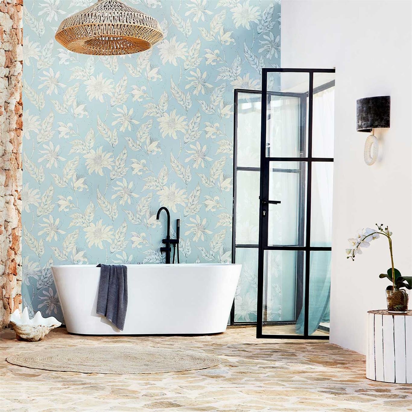 Hand drawn in pen and watercolour, this beautiful contemporary wallpaper is adorned with stylised tropical flowers. With its delicate painterly look and soft colour palette, intricate linework adds detail to this elegant design.