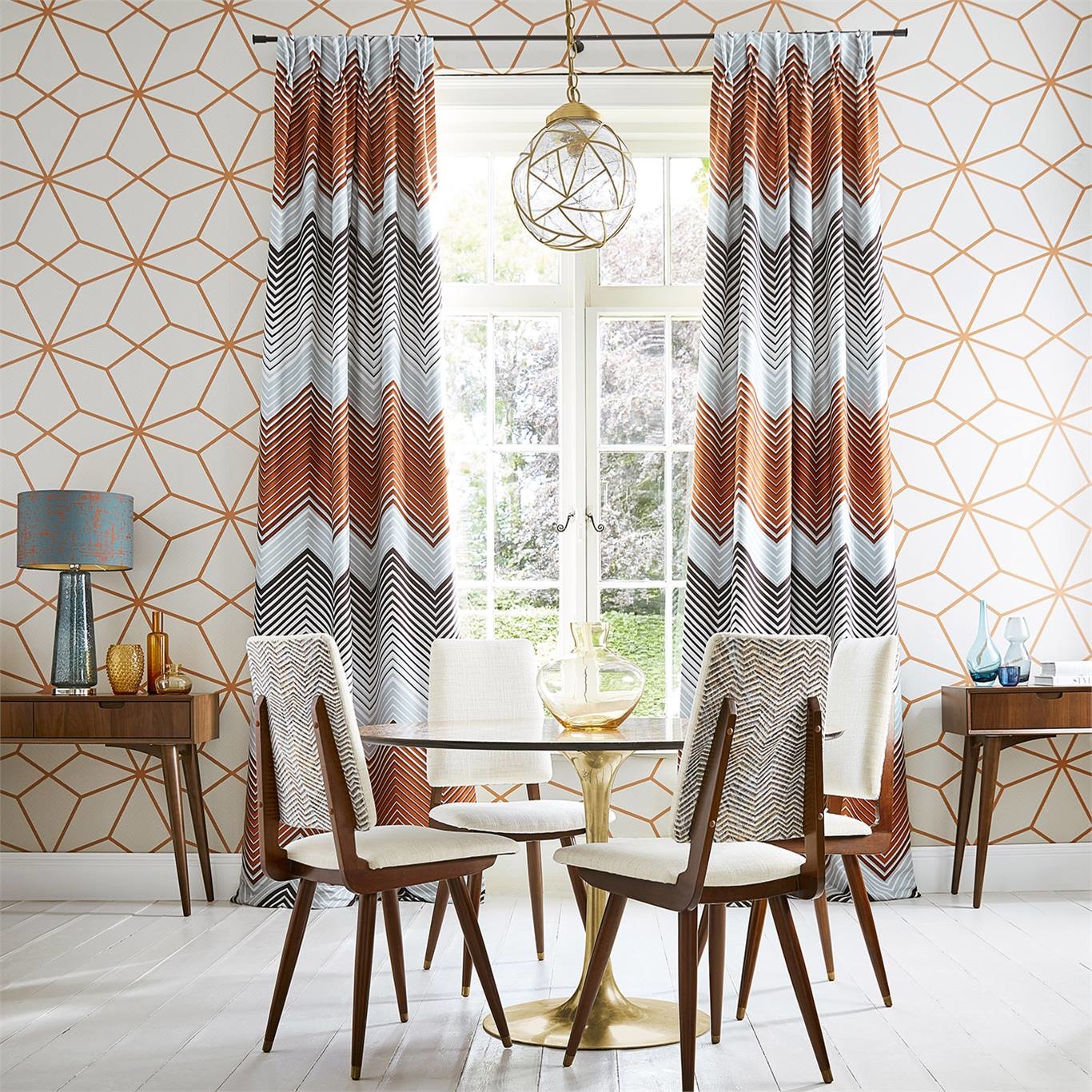 Axal is a highly contemporary wallpaper with a large scale geometric design on a textured woven effect ground. The rust colourway has a special grit effect giving a tactile quality to this Momentum design.