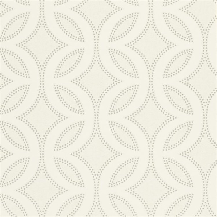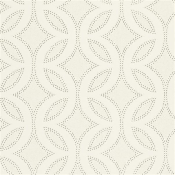 A mid-scale lace trellis design adorns this charming wallpaper, printed on a neutral background with hints of reflective inks for added opulence.