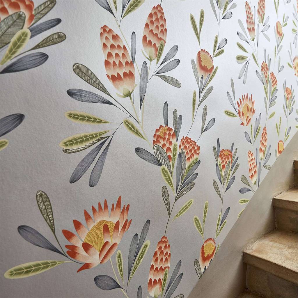 This lively wallpaper features a floral trail printed in textured and chalky finishes on a range of metallic and flat backgrounds. A welcoming addition to hallways and good looking alongside the fabric of the same name.