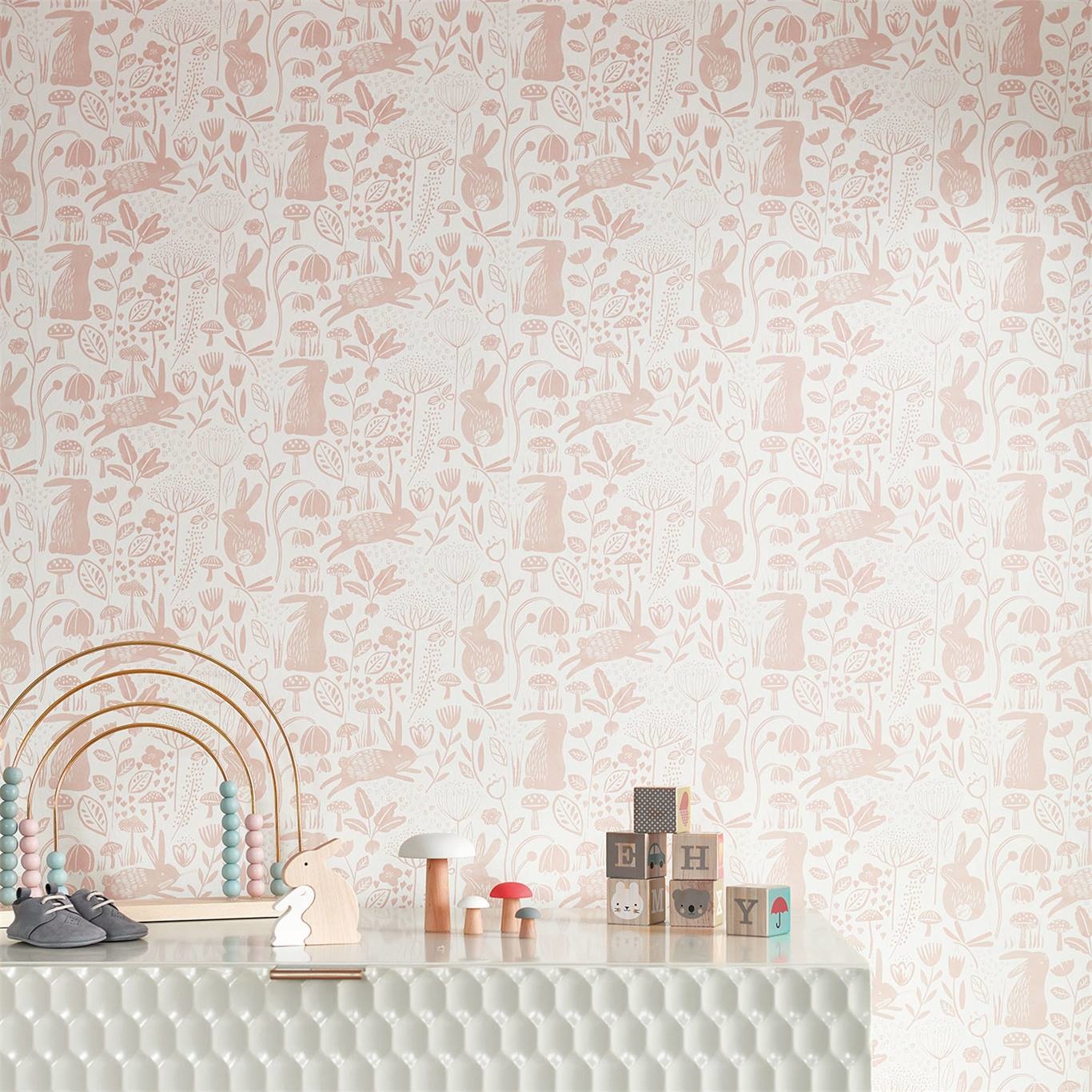 An enchanting woodland scene of bouncing bunnies playing amongst grasses and flowers. Can you spot the radish, fresh and delicious, ready for our friends to nibble? From dusk to dawn the fun never ends in this classically English wallpaper scene.