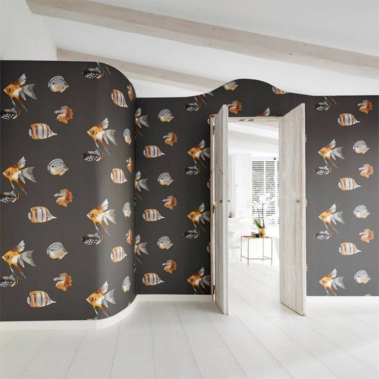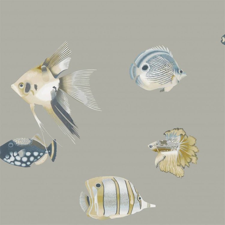 From Anthozoa Wallpapers, Kamanu features botanical fish gently swimming through the water. Hand-drawn with small metallic touches, the design creates glistens with movement.