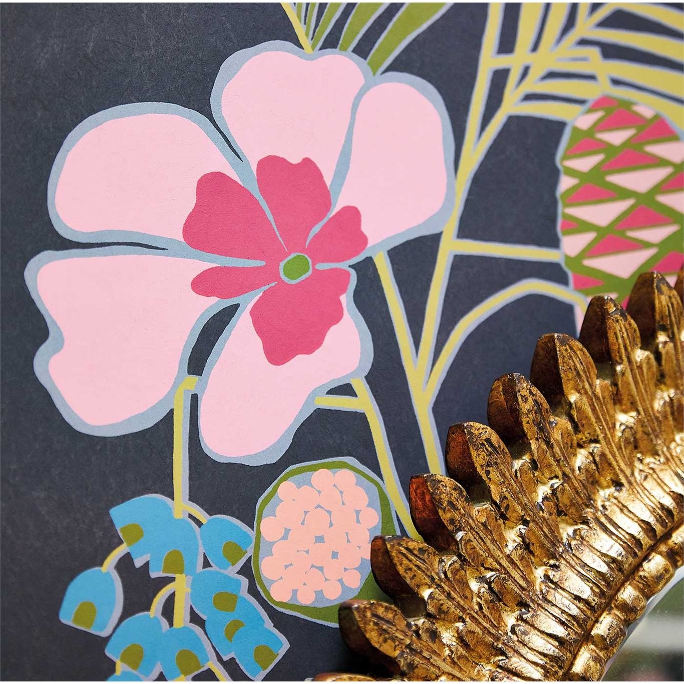 Combining elements the stylised Maya and Foxley designs, this striking feature wallpaper makes a stripe when hung. The gold and platinum colourways have a luxurious metallic ground which catches the light beautifully.