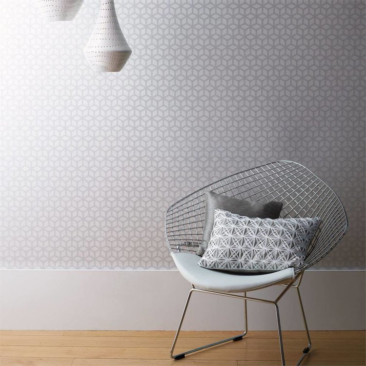 Trellis wallpaper. A lattice design in both subtle neutrals and bold flat tones, embellished with metallics and sparkling beads.