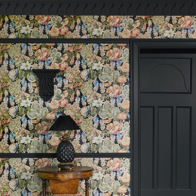 Amatoria is a wallpaper with a vintage floral print inspired by the 1930s. This wallcovering from House of Hackney shows lush blooming tiger lilies, roses and lily of the valley. A beautiful wallpaper that is perfect for a romantic, vintage and floral interior.