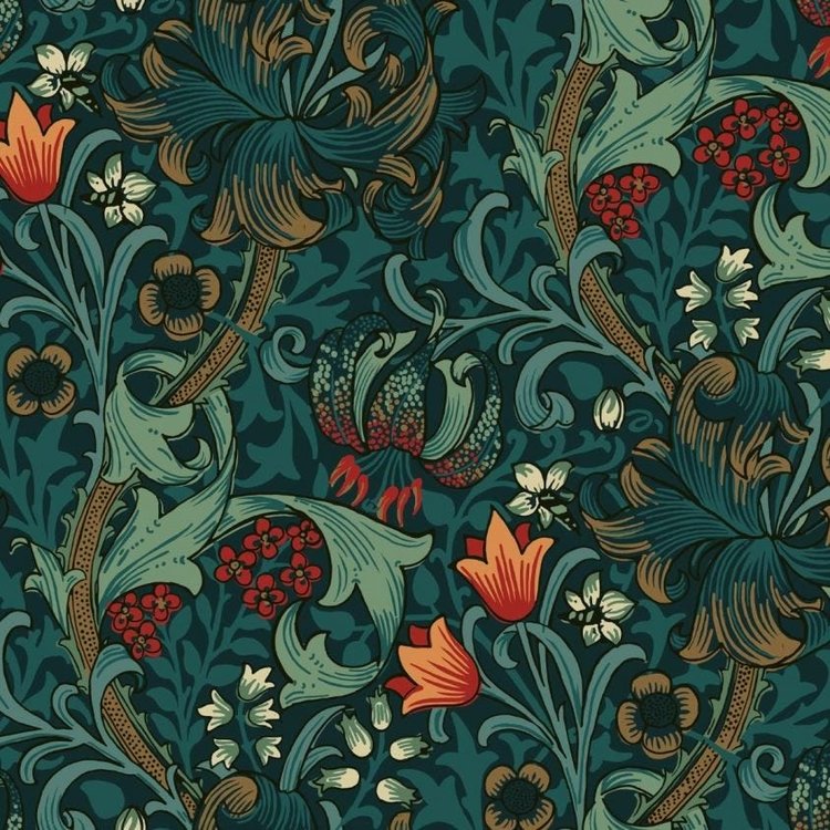 Originally created by our design hero, William Morris, GOLDEN LILY dates back to the 1890s – yet is both timeless and fresh in feel. Now, we’ve played with the scale of its entwining lily stems and tendrils, enlarging the print for a grander feel, then repainted it against a backdrop of buttermilk cream with pops of verdant green, teal, butterscotch and berry red.