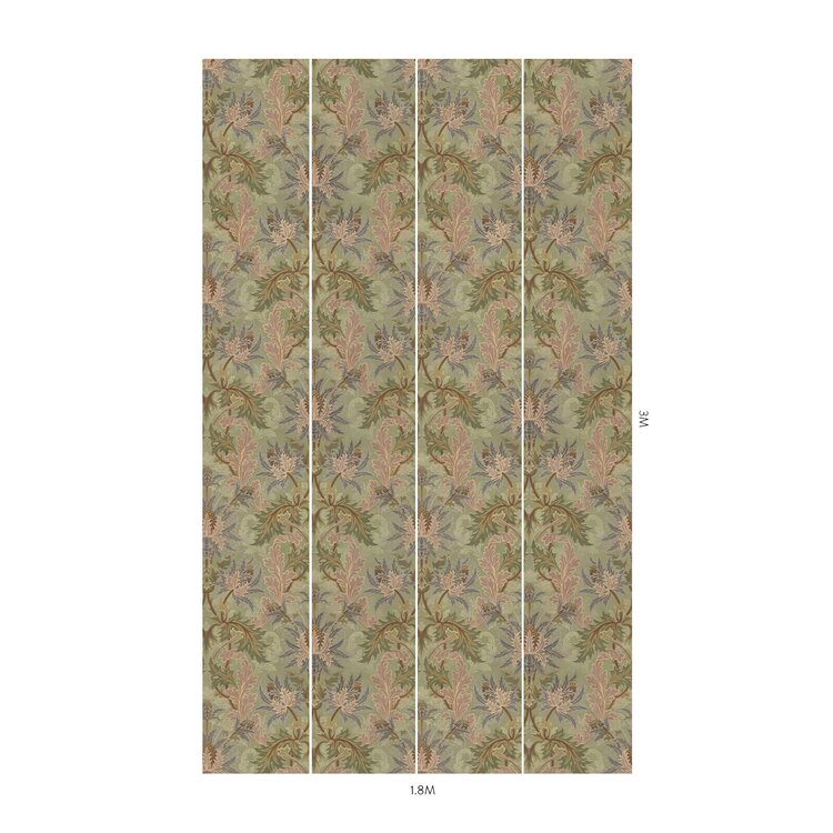 Inspired by sacred sea holly, this oceanic damask wallpaper in soft apple green will bring a touch of Celtic charm to your space with its climbing petals and swirling leaves. A symbol of luck, perseverance and security, hang in your home as a protective talisman like in the days of old; the perfect print for bedrooms, hallways and any space on a threshold.