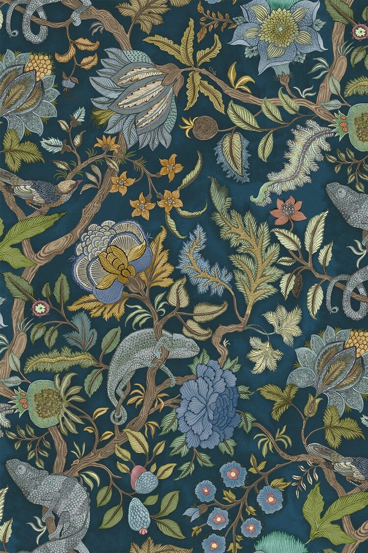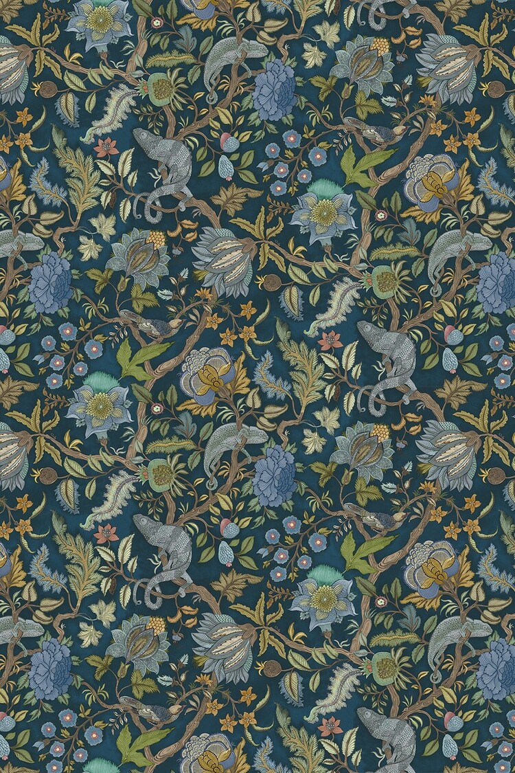 Chameleon Trail is a wallpaper with a playful design. This wallcovering by Josephine Munsey, from the Portfolio 2 collection, shows an exuberant tree of life with twirling branches, lush flowers, colorful birds and chameleons. A lush wallpaper that is perfect for a botanical and colorful interior.
