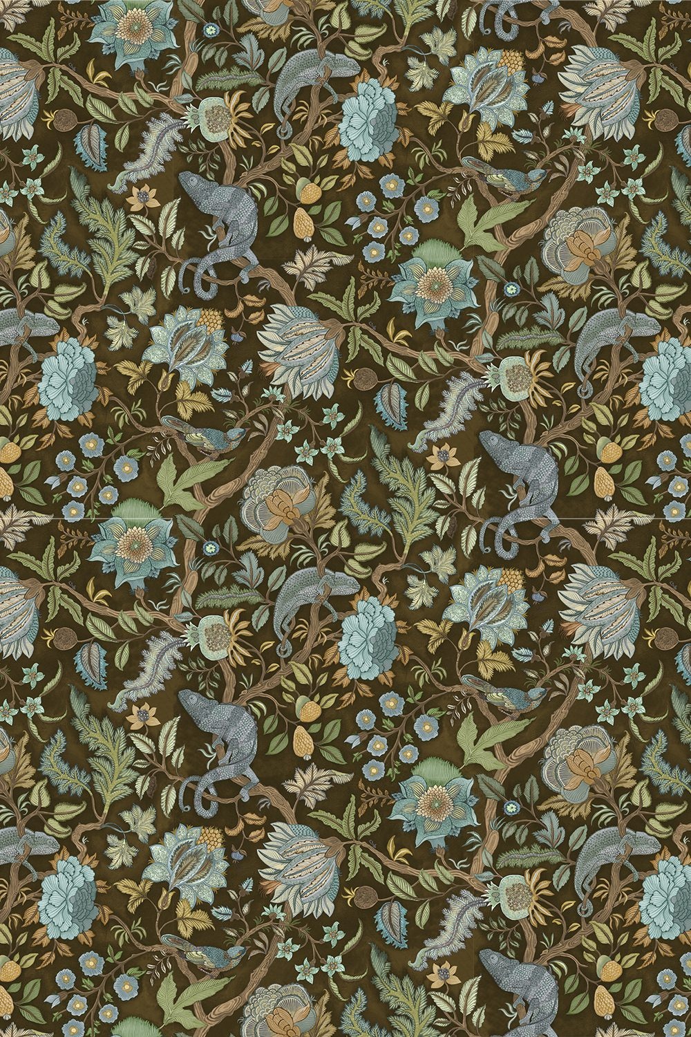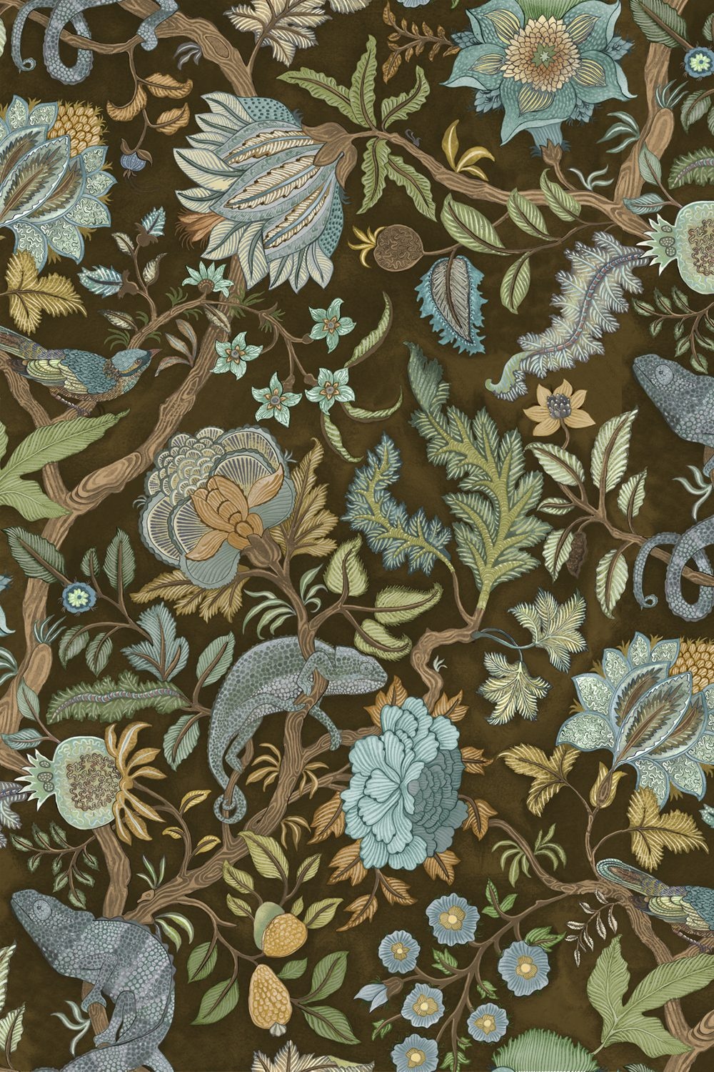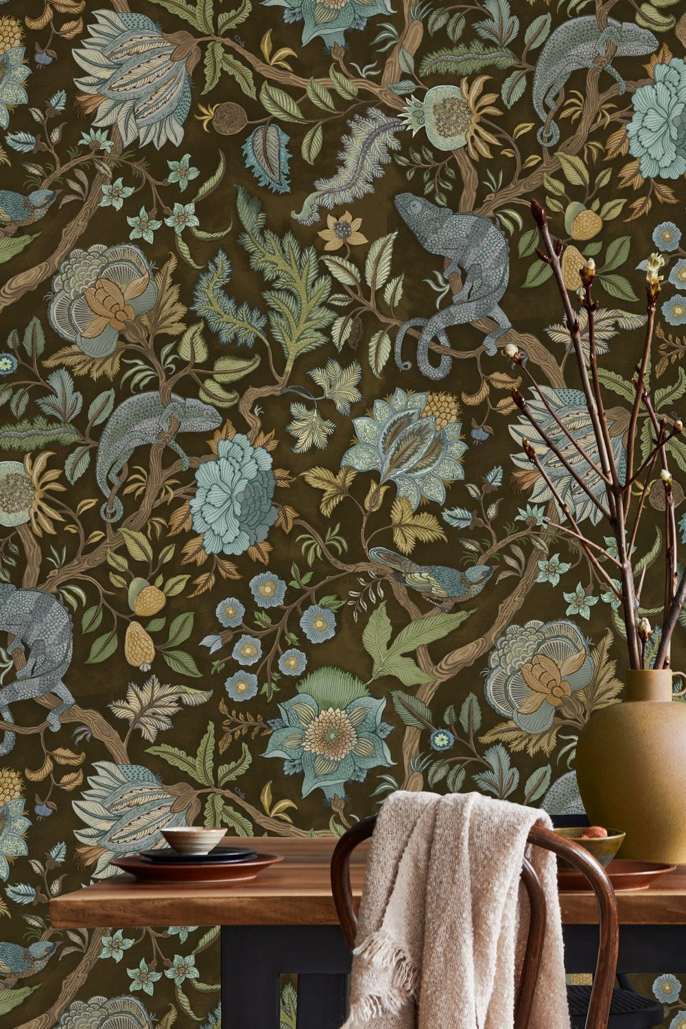 Chameleon Trail is a wallpaper with a playful design. This wallcovering by Josephine Munsey, from the Portfolio 2 collection, shows an exuberant tree of life with twirling branches, lush flowers, colorful birds and chameleons. A lush wallpaper that is perfect for a botanical and colorful interior.