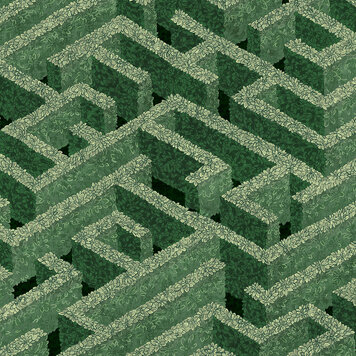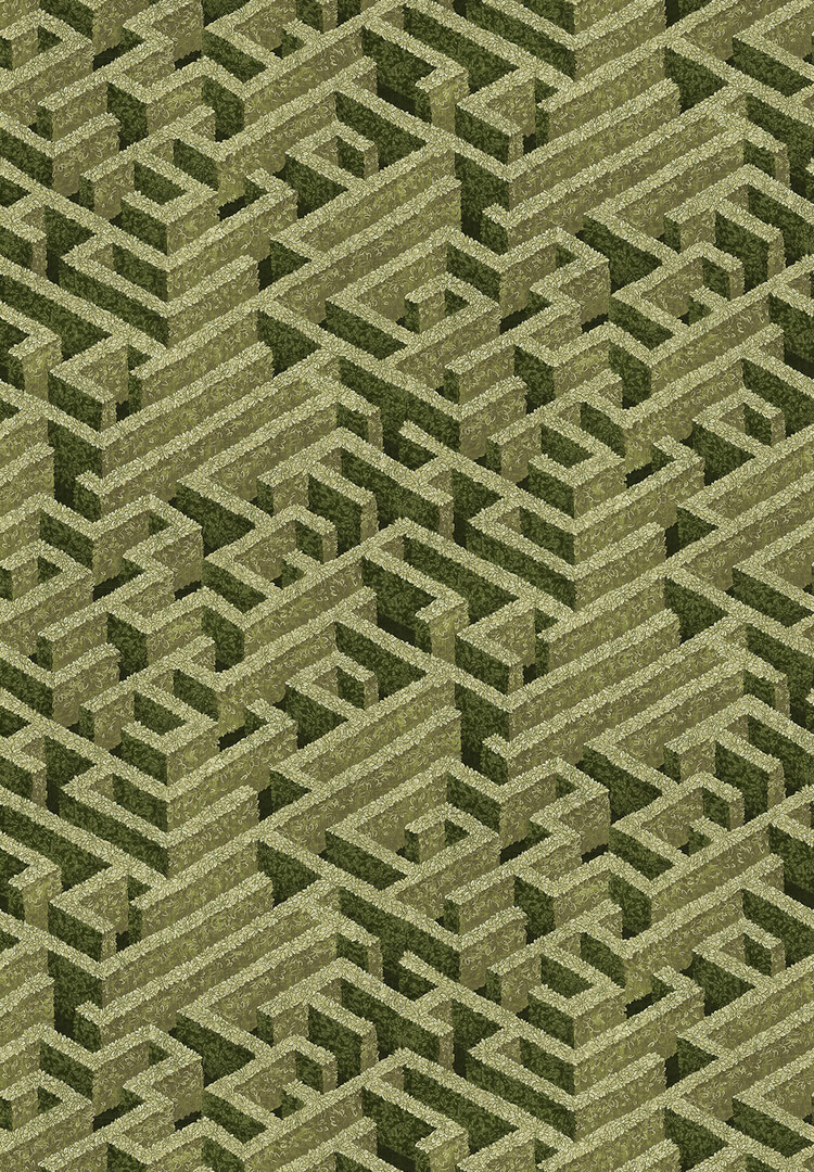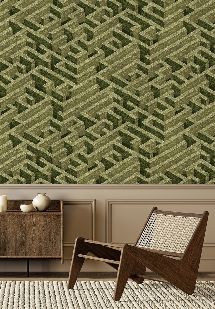 Labyrinth wallpaper is inspired by Escher's mathematical designs. This wallcovering by Josephine Munsey, from the Portfolio 1 collection, shows a labyrinth of green hedges. This is a special wallpaper with a wink that is perfect for a botanical, playful and graphic interior.