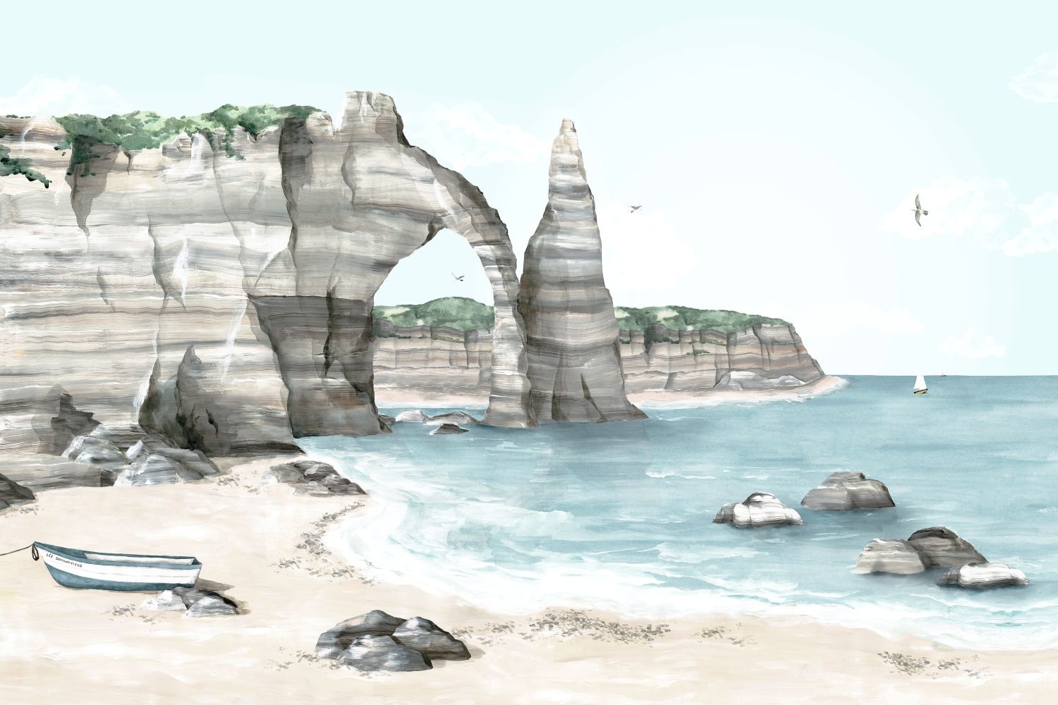 The Douce France collection is a panoramic wallpaper collection by Les Dominotiers, a French brand known for its stylish wall murals and bespoke wallpapers. The idea: a bit like flipping through a sketchbook after a journey — a pure love letter to the diversity of the French landscape, from coasts to mountains, from marshes to Mediterranean towns.