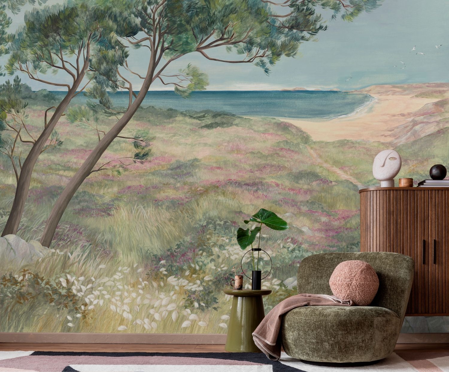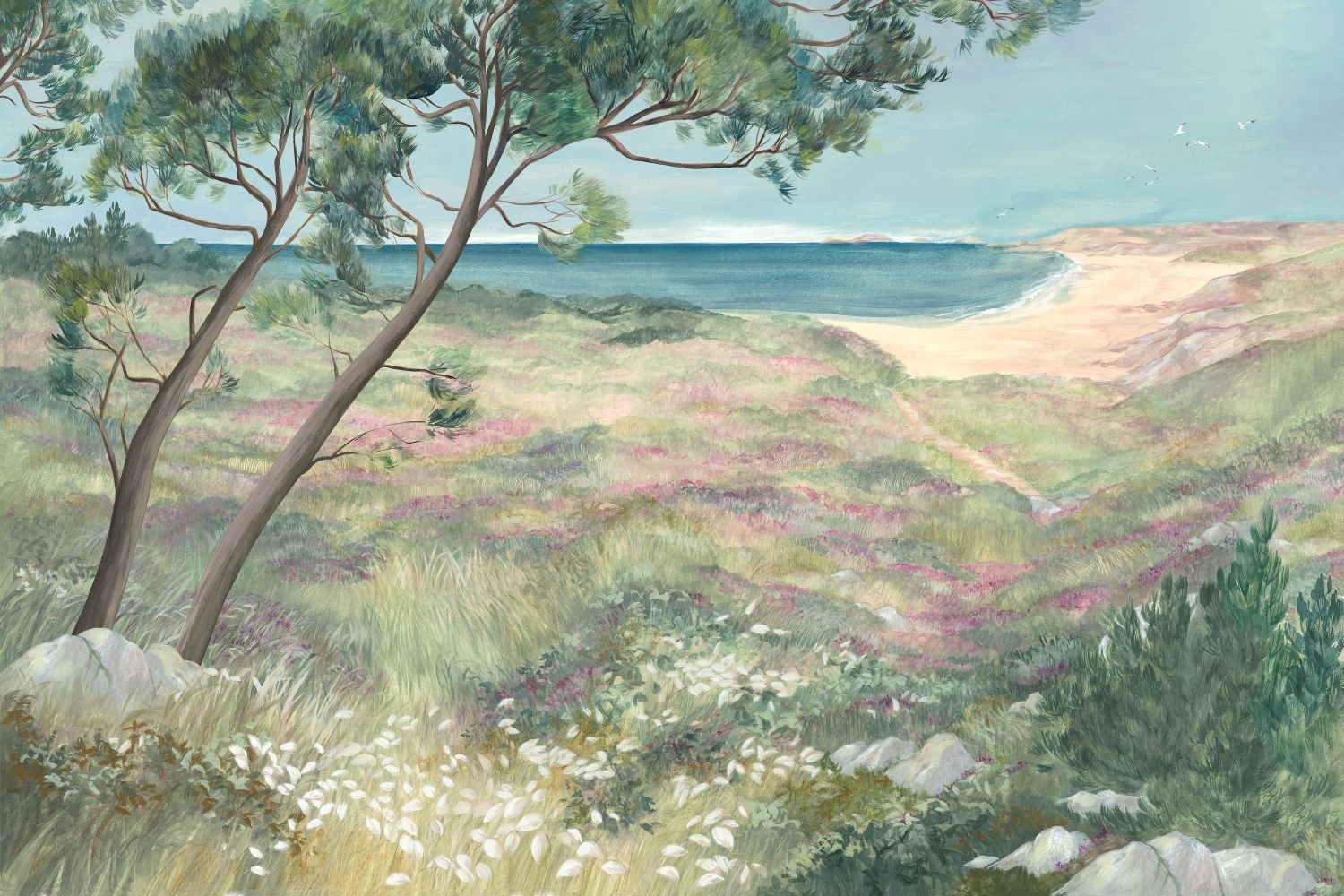 The Douce France collection is a panoramic wallpaper collection by Les Dominotiers, a French brand known for its stylish wall murals and bespoke wallpapers. The idea: a bit like flipping through a sketchbook after a journey — a pure love letter to the diversity of the French landscape, from coasts to mountains, from marshes to Mediterranean towns.