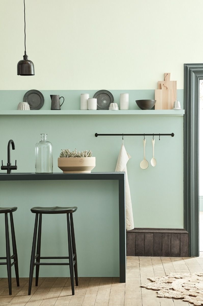 This is Aquamarine Light: a greenish blue shade. This Little Greene paint is light (although slightly darker than the Pale variety), neutral and versatile. The perfect paint for a timeless, classic and calm interior.