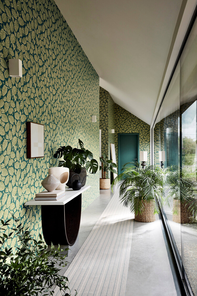 Beech Nut' (Oxburgh Hall) c.1782 An authentic, late Georgian design, this paper was uncovered at Oxburgh Hall in Norfolk. Originally used within a brightly-coloured, flocked, floral border, the leaf and nut element was block-printed in a rather more subdued grey colourway. While its six contemporary interpretations are unashamedly more colourful, each one uses a similarly balanced colour palette alongside the signature, crafted texture of a surface-printed paper.