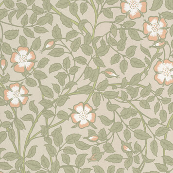 This wallpaper is characterized as being designed in the “Arts and Crafts†style, which is evident from the densely stylized natural motifs. The original design was created by children's book illustrator Walter Crane. “Briar Rose†initially formed the background of a wallpaper pattern called “The Sleeping Beautyâ€. The wallpaper was found in Oxburgh Hall, but it is not known in which room. A large part of the original wallpaper still exists, but these are only loose samples. It was originally produced by the London firm Jeffrey & Co.