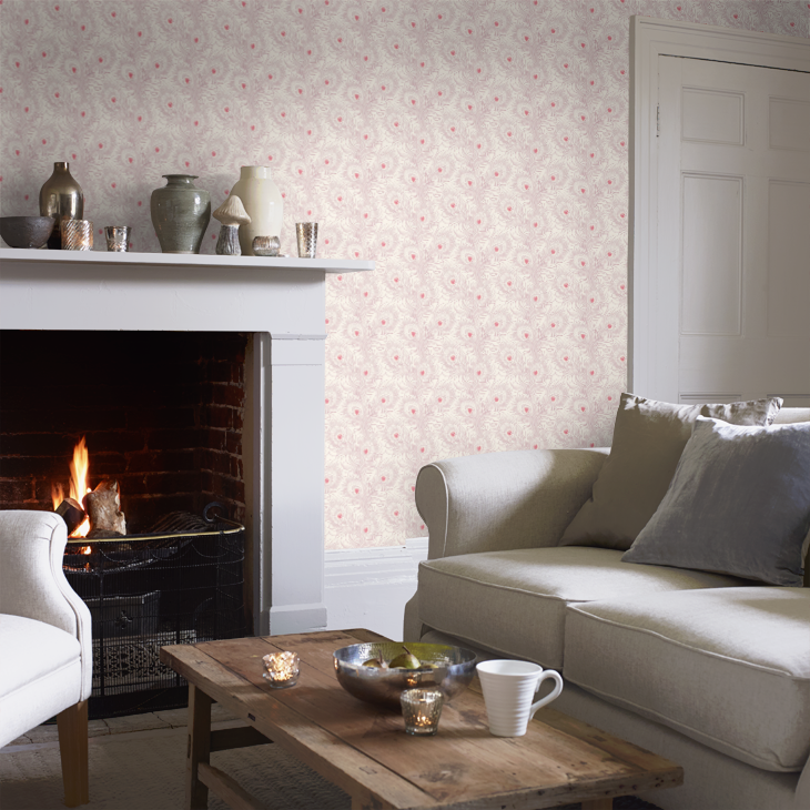 A flamboyant design with peacock feathers found in the attic of 18 Carlton House Terrace; a beautiful row of stucco houses with a view of The Mall in London. Originally the design was machine printed in green on a yellow background. A modern printing technique has been applied to accurately imitate the original design. A judiciously chosen touch of color in the peacock feather makes the design fit within contemporary interiors.