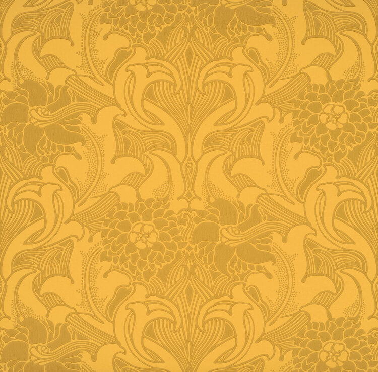 A continuous floral motif reminiscent of Voysey's early work. This two-tone wallpaper features an enlarged dahlia, a motif characteristic of Japanese designs, while the winding plant shapes based on a single flower are also characteristic of Art Nouveau.