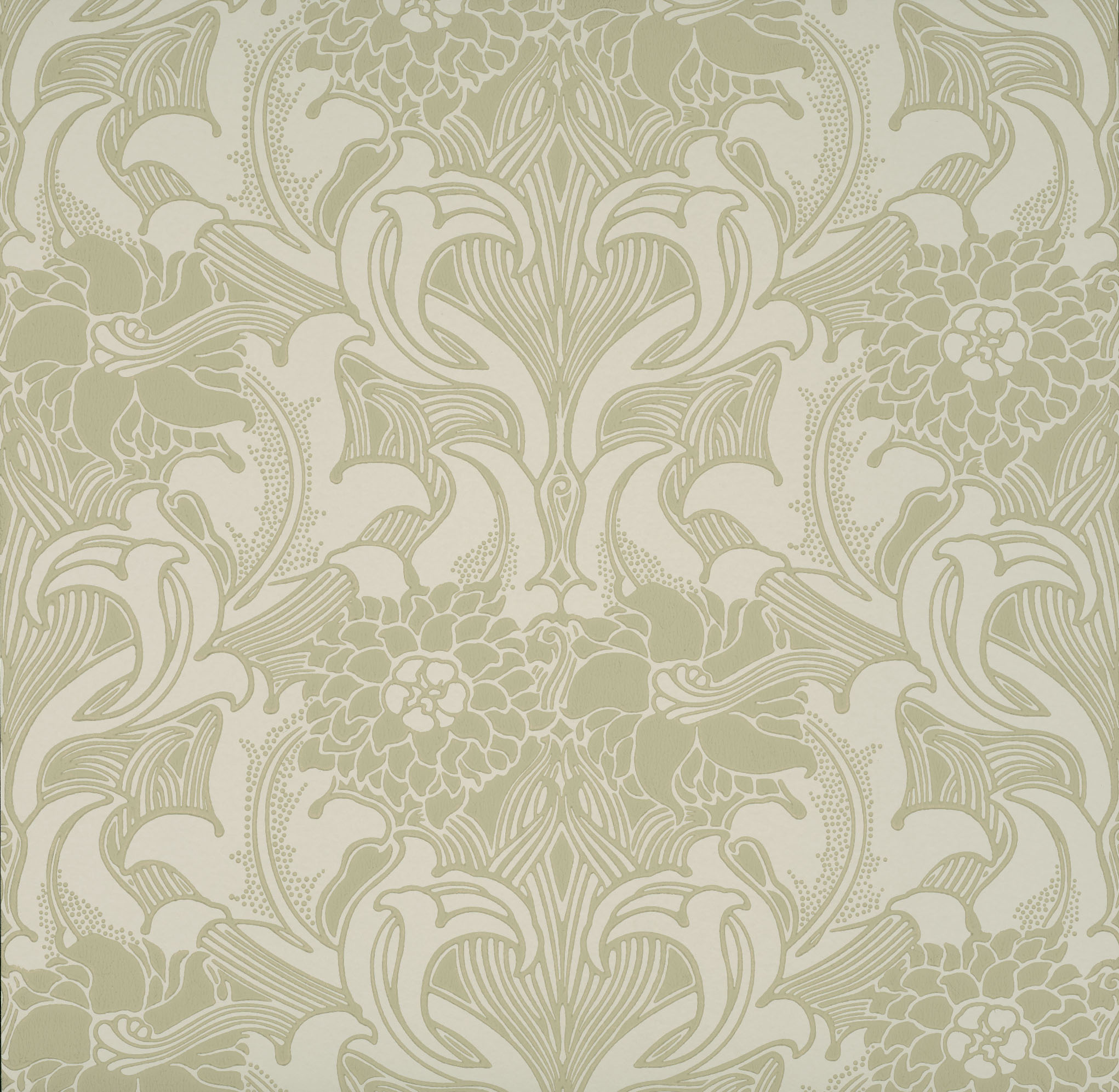 A continuous floral motif reminiscent of Voysey's early work. This two-tone wallpaper features an enlarged dahlia, a motif characteristic of Japanese designs, while the winding plant shapes based on a single flower are also characteristic of Art Nouveau.