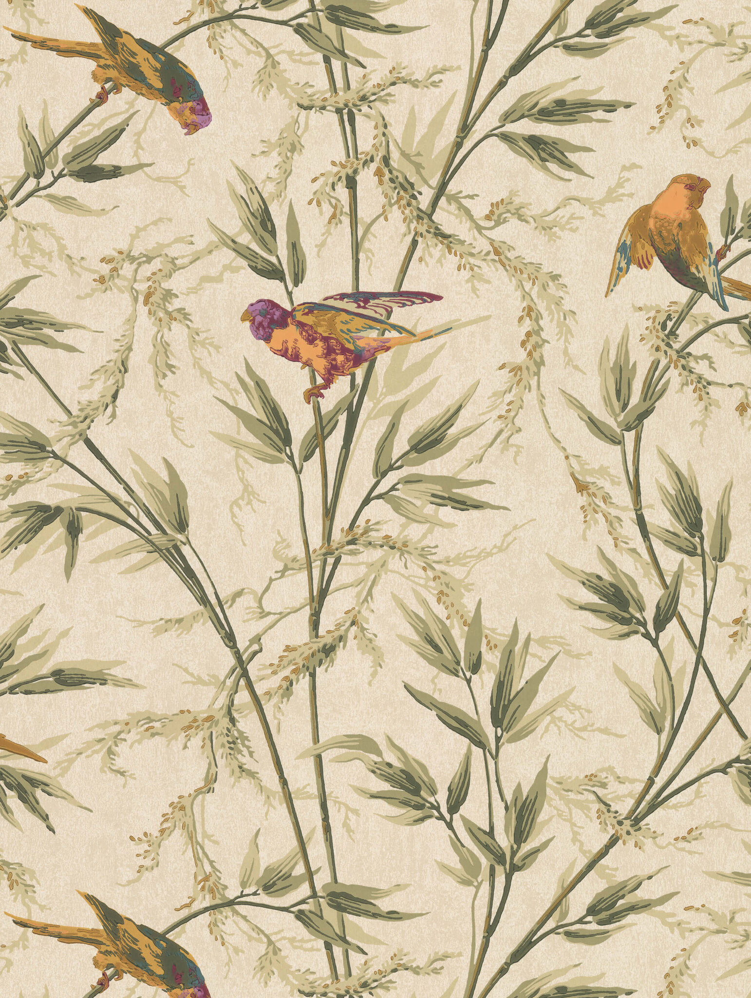 The eclectic collection features a wide range of exotic birds, stylized flowers and winding paths, alongside floral prints and large-scale tropical murals.