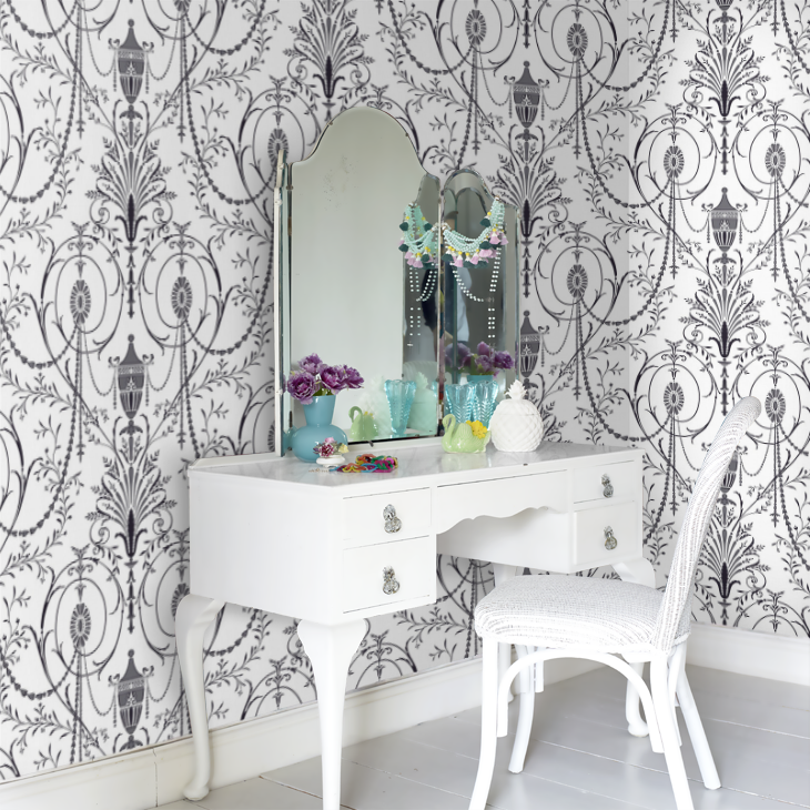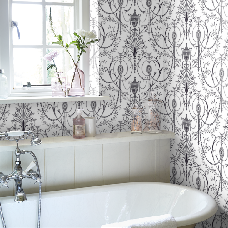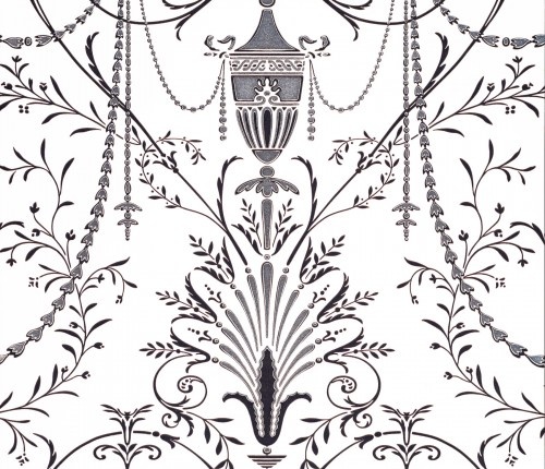A large-scale pattern, reminiscent of an early 20th-century interpretation of a Robert Adam design. This wallpaper was discovered shortly after the death of Queen Mary, who lived at Marlborough House until 1953. The house then became the headquarters of the Commonwealth Secretariat.