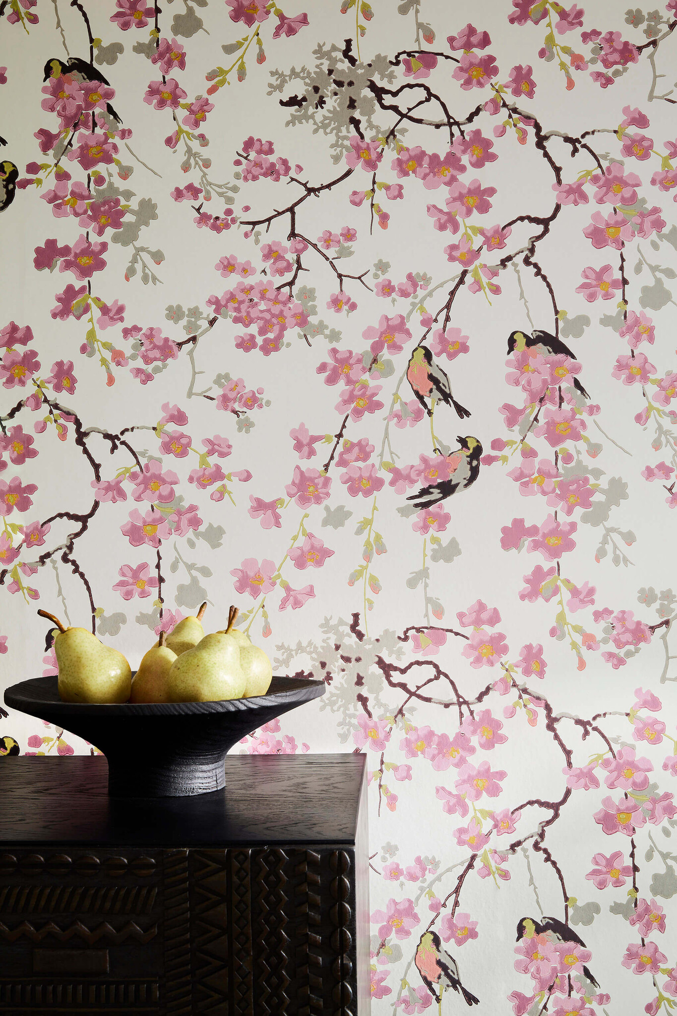 ‘Massingberd Blossom’ (Gunby Hall) c.1905 The wallpaper from which this design is drawn, is most likely of British Edwardian origin, but stylistically is very representative of the era’s passion for oriental design, which – in a time of pre-modern artistic sensibility – was seen to retain a close connection to nature, simplicity and harmony. The trailing blossom and repeating birds are elements commonly found in early, hand-painted chinoiserie, and the use of traditional surface printing retains a tactile quality that subtly offers more to the discerning eye than a conventionally mass-produced paper. It once adorned the walls of the Grey Room at Gunby Hall in Lincolnshire, a large country house built some 200 years earlier for the Member of Parliament William Massingberd, that was bequeathed to the National Trust in 1944.