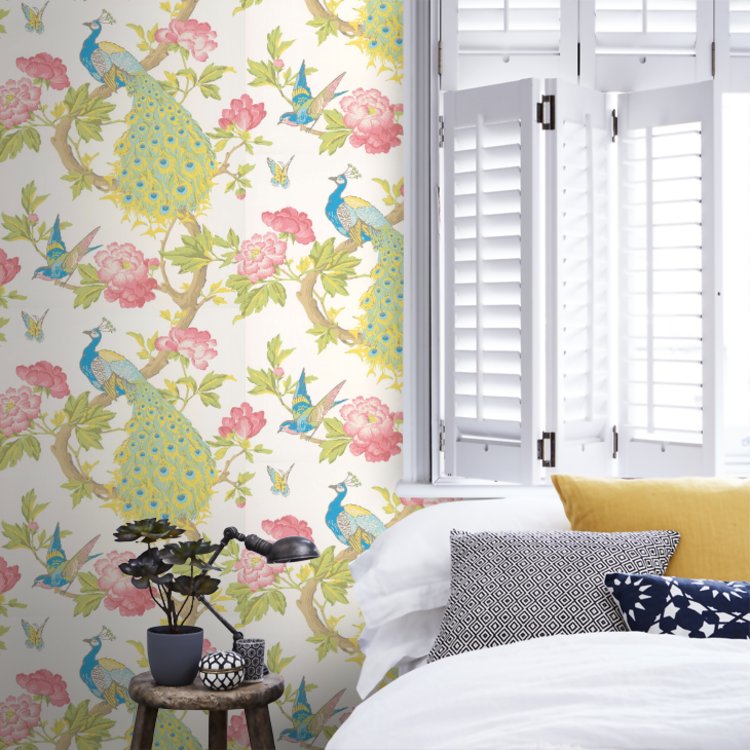 This flamboyant, vibrant peacock design is a beautiful example of late-19th century wallpaper printing. Found on a lobby wall at Erddig in Wales, it was hung in the 1870s, and has the painterly finish of a traditional Chinese silk. Showing peacocks perched on branches, accessorised by flowers, leaves and birds, the subject is typical of wallpapers and fabrics produced to satisfy the western elite’s interest in Chinese design. Coloured in eight vibrant ways including elegant pale and bolder dark grounds, and even a shimmering gold