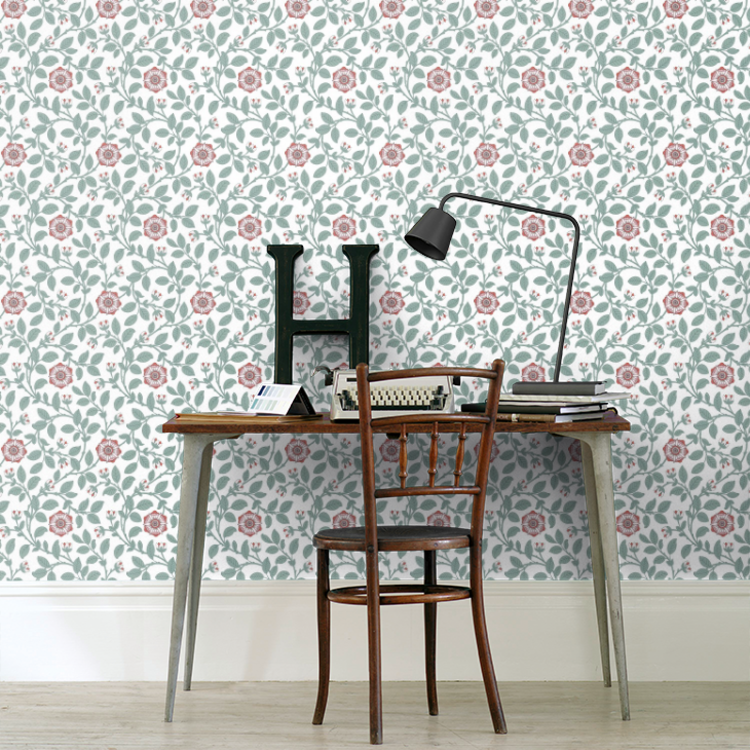 It's a little disrespectful given the quality of this 19th century wallpaper, but the scrap of wallpaper that could be saved came not from the walls of a swanky Richmond mansion, but from a dumpster that stood in front of this house when it came into 1989 was renovated. The design, with a delicate Tudor rose, is in the William Morris style of the late 19th century. Little Greene printed it in two authentic Arts & Crafts colors, three classic colors and a modern metallic shade.