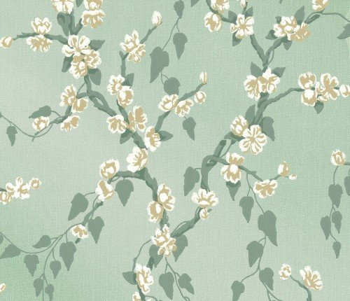 Sakura (c1936) is a pretty trail of matt leaves and delicate blossom originating in France. The surface detail has been retained, contributing to its charming layered depth, whilst the colouration has retained an elegant, seductive informality. A mica ground has been used on some colourways to exaggerate the interplay of light and contrast on the surface of the paper.