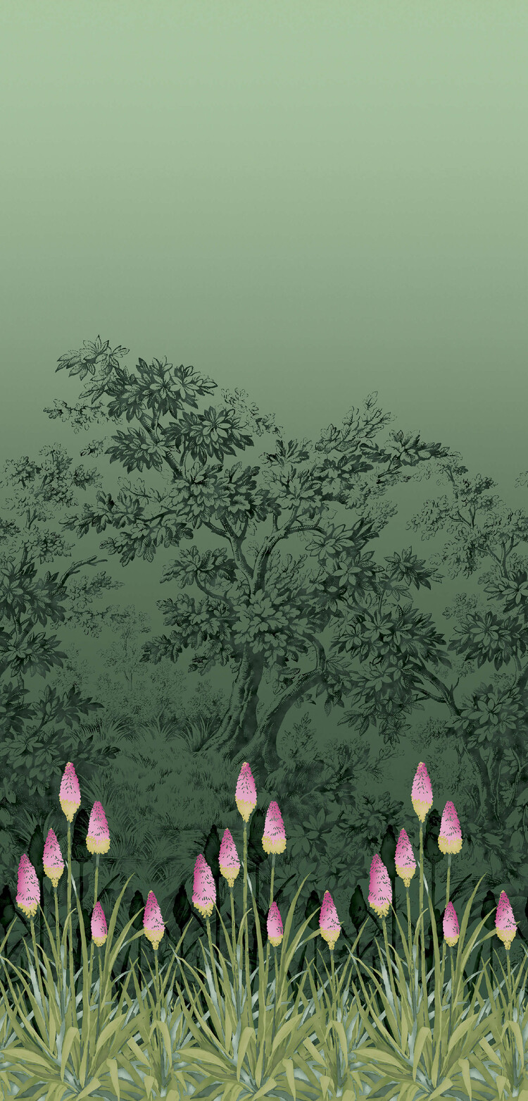 Brightly colored Kniphofia flowers have been used in this wallpaper design. The more famous Dutch name is torch lily or torch (these originate from Africa, but are named after the German horticultural expert Johan Hieronymous Kniphof). English Heritage records say that these flowers were hand painted and custom-fitted onto a previously applied wall covering in a late 18th century building on Upper Brook Street. Little Greene adapted the Stag Toile motif as a natural backdrop for the torch lilies.
