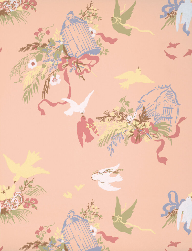 A more contemporary find is this wallpaper with doves, ribbons and flowers in the style of the 1950s. It is a reworking of an 18th century design. It was found in Oxburgh and an archive photo revealed the location of this wallpaper in the family's private quarters, upstairs in one of the bedrooms. The wallpaper would have been a visible reminder of the last days of Oxburgh in the family, as the mansion was put up for sale just months after the paper was produced. The original soft pink has been reproduced in the colors of Little Greene, alongside four more contemporary color combinations.