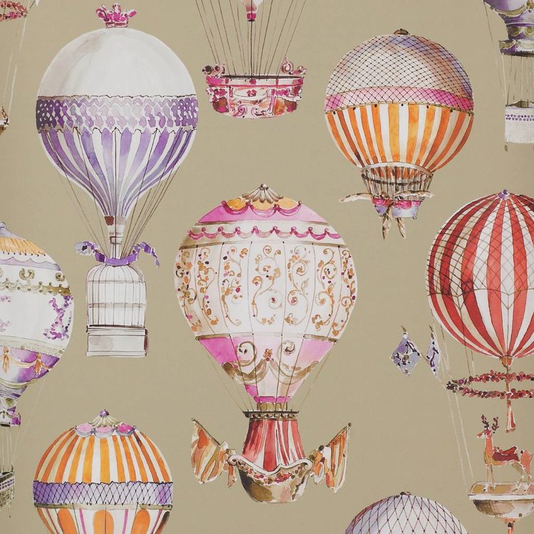 L'Envol, the signature wallpaper design from this collection. A colorful collection of elegant hot air balloons, shown here in Tomate.