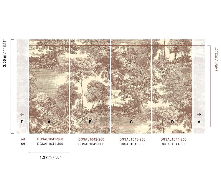 Please note: This panel consists of 4 lanes. These lanes are each 3 meters high and 127 centimeters wide. When put together, the panel is 3 meters high and 5,08 meters wide. You complete this mural by ordering the 4 panels with item codes DGSAL1041, DGSAL1042, DGSAL1043 and DGSAL1044 (see image).