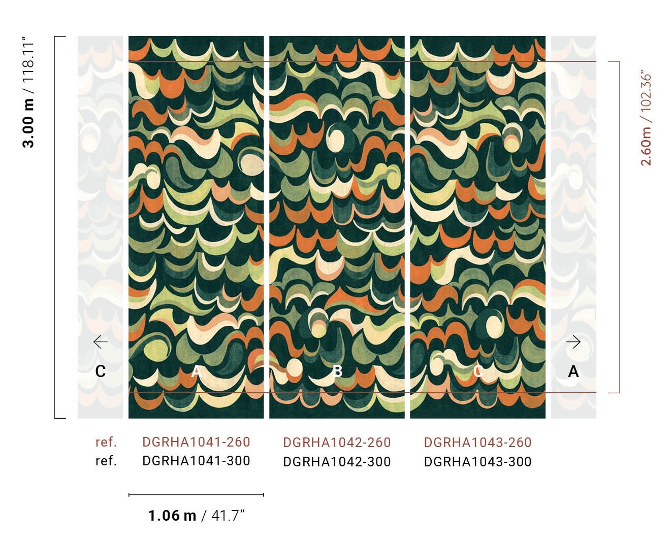 This panel consists of 3 lanes. These lanes are each 3 meters high and 106 centimeters wide. When put together, the panel is 3 meters high and 3,18 meters wide. You complete this mural by ordering the 3 panels with item codes DGRHA1041, DGRHA1042 and DGRHA1043 (see image).