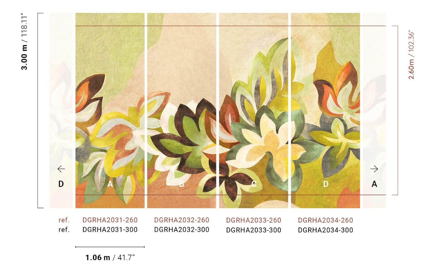This panel consists of 4 lanes. These lanes are each 3 meters high and 106 centimeters wide. When put together, the panel is 3 meters high and 4,24 meters wide. You complete this mural by ordering the 3 panels with item codes DGRHA2021, DGRHA2022. DGRHA2023 and DGRHA2024 (see image).
